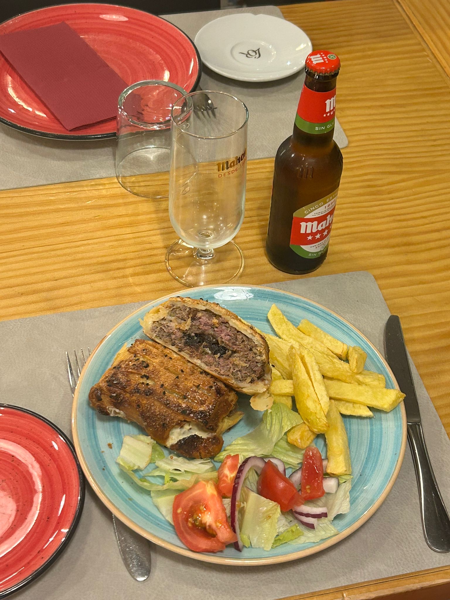 Hartos del formato pan de hamburguesa nos hemos decidido por hacer un hojaldre para la hamburguesa. Mucho más sabor ya que se cocina dentro del hojaldre y no pierde nada de grasa. Original y distinta a cualquier otra aportando dulzor con tres ingredientes que se emparejan muy bien con las piemientas el queso y la cecina q son tostados.