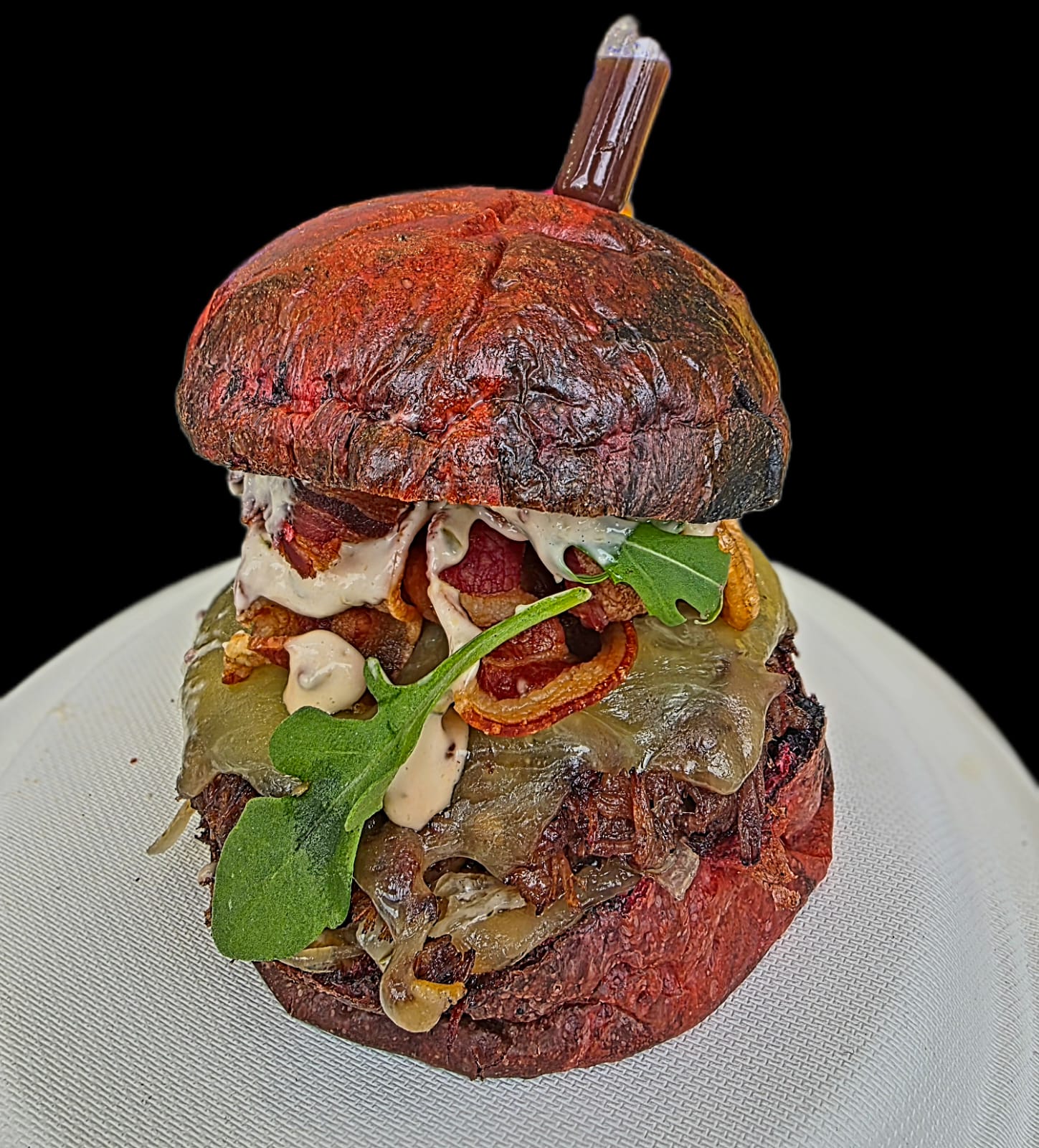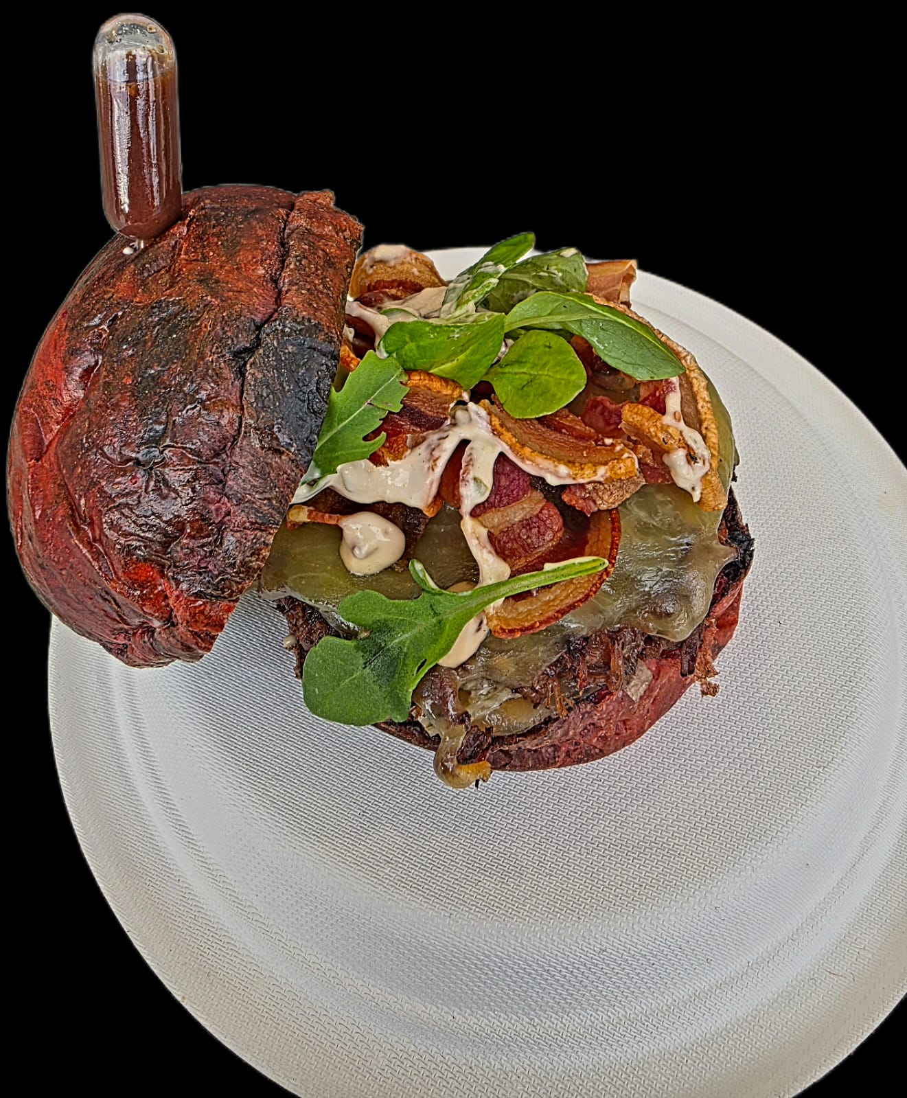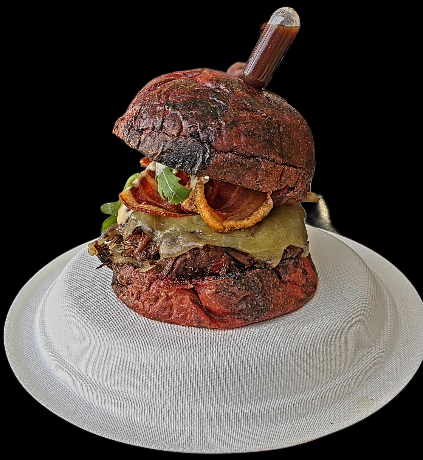 Pan Brioche Bicolor High Black & Red Bun, Salsa de Pepinillos Agridulces, Mostaza de Dijon, Mayonesa, Miel, Sal y Pimienta, Rabo de Toro Guisado a Baja Temperatura durante 10 horas y Desmigado, Queso Monterrey, Cebolla Caramelizada, Crujiente de Torreznos, Brotes Frescos, Pipeta con Salsa de su Propio Guiso.