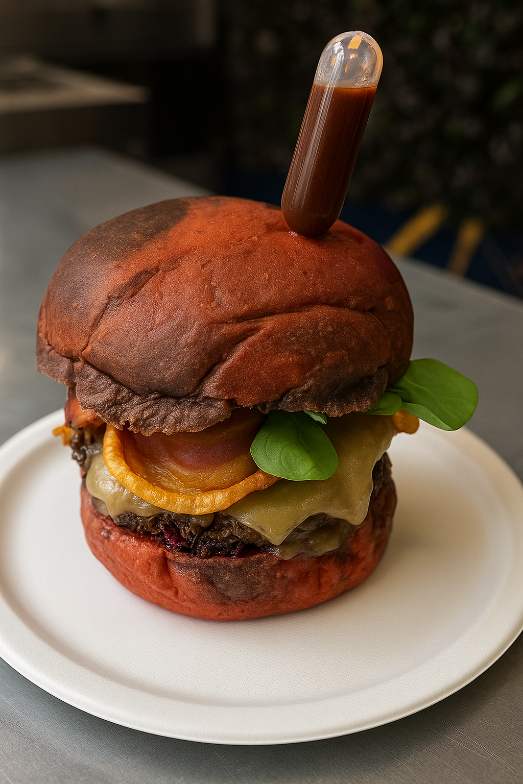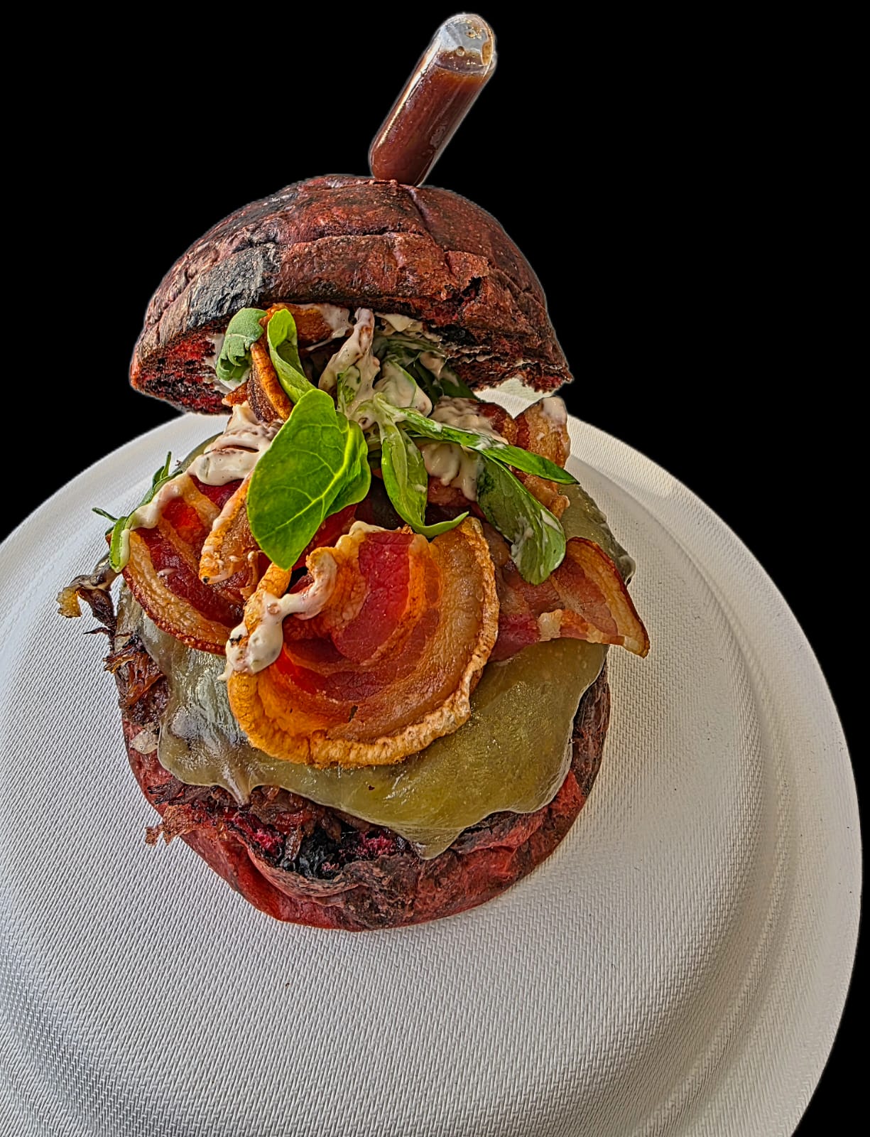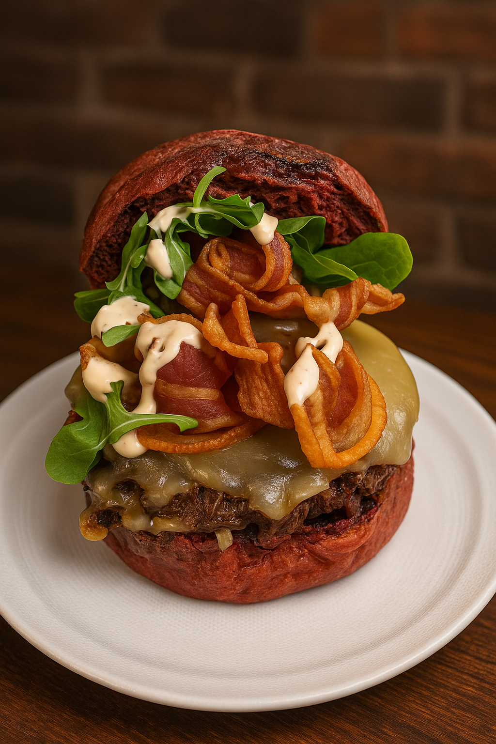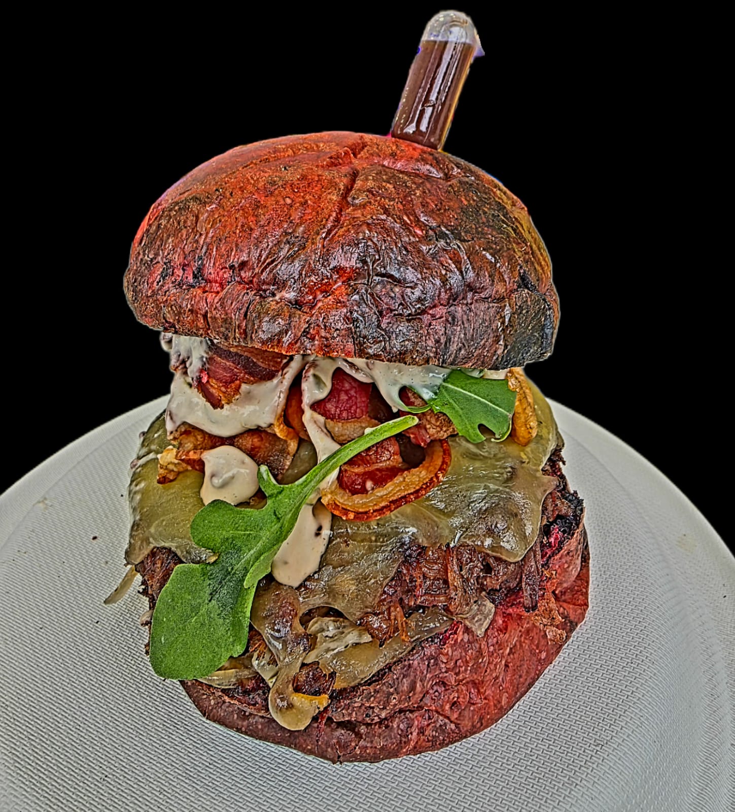 Pan Brioche Bicolor High Black & Red Bun, Salsa de Pepinillos Agridulces, Mostaza de Dijon, Mayonesa, Miel, Sal y Pimienta, Rabo de Toro Guisado a Baja Temperatura durante 10 horas y Desmigado, Queso Monterrey, Cebolla Caramelizada, Crujiente de Torreznos, Brotes Frescos, Pipeta con Salsa de su Propio Guiso.
