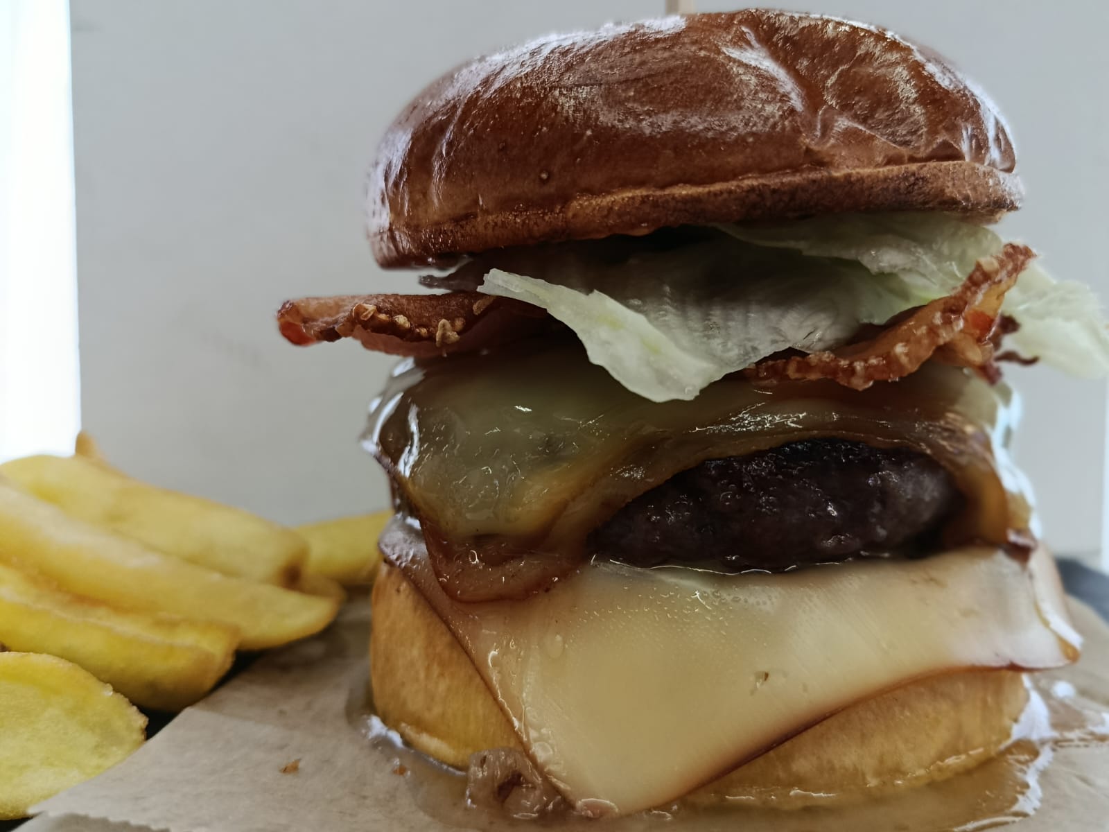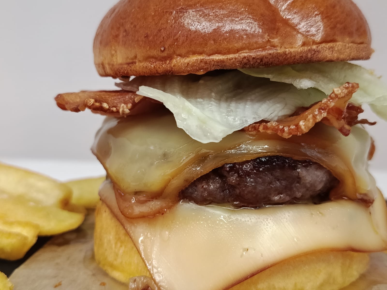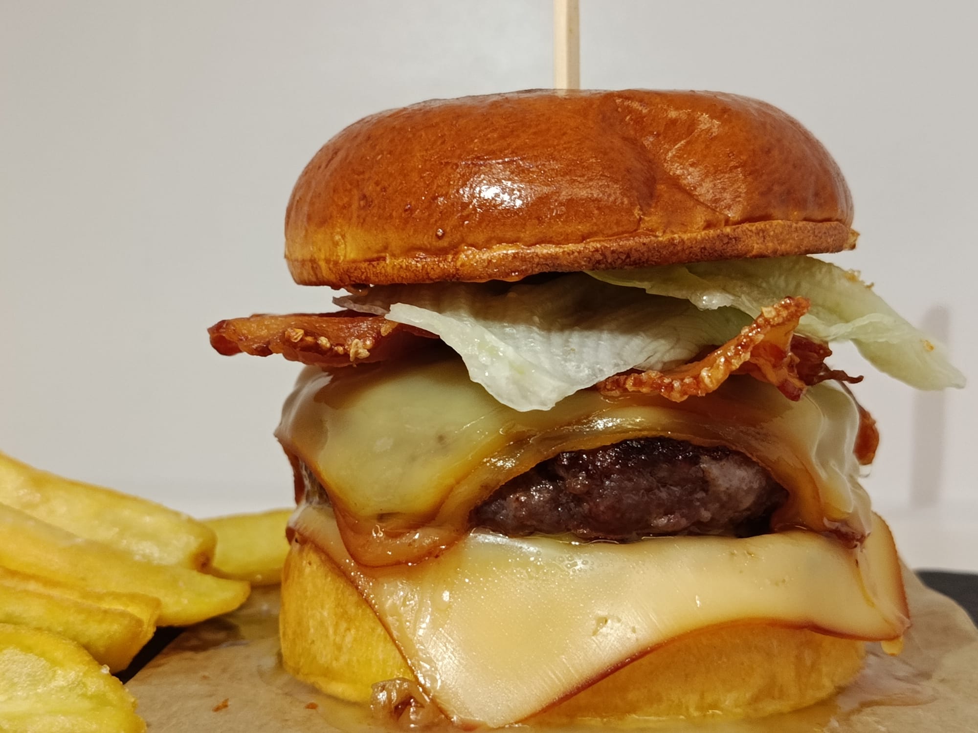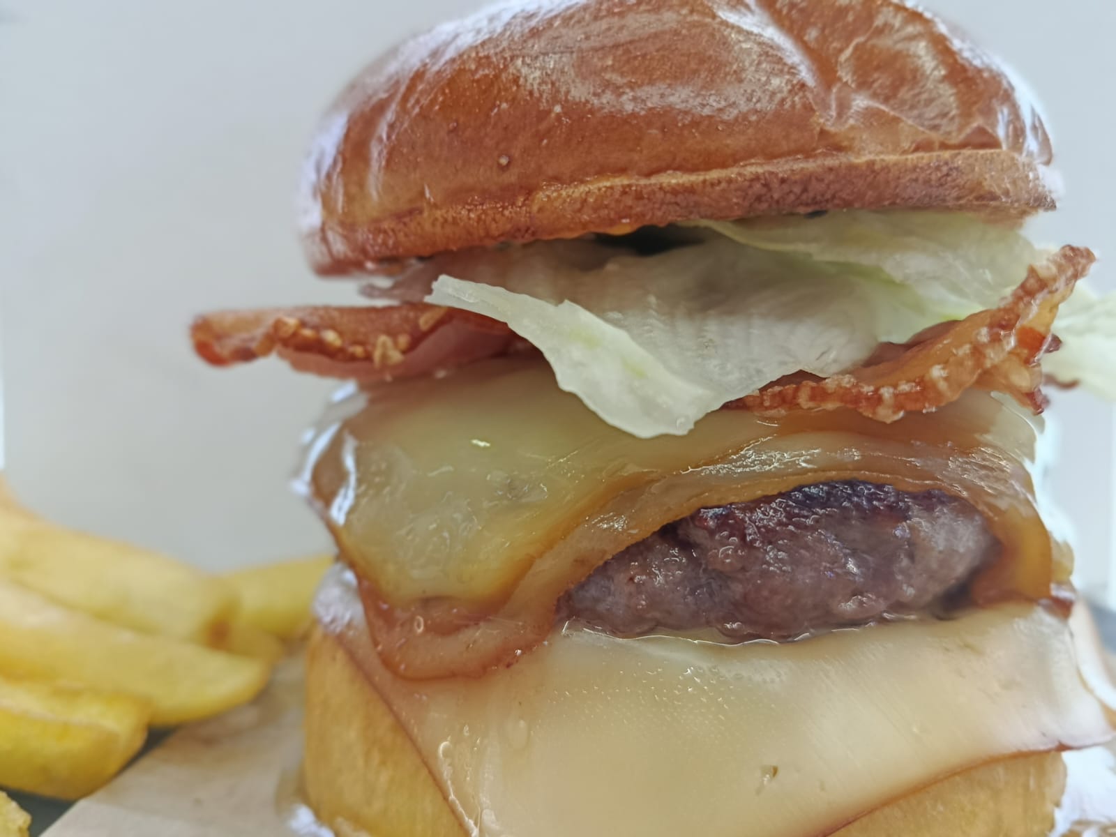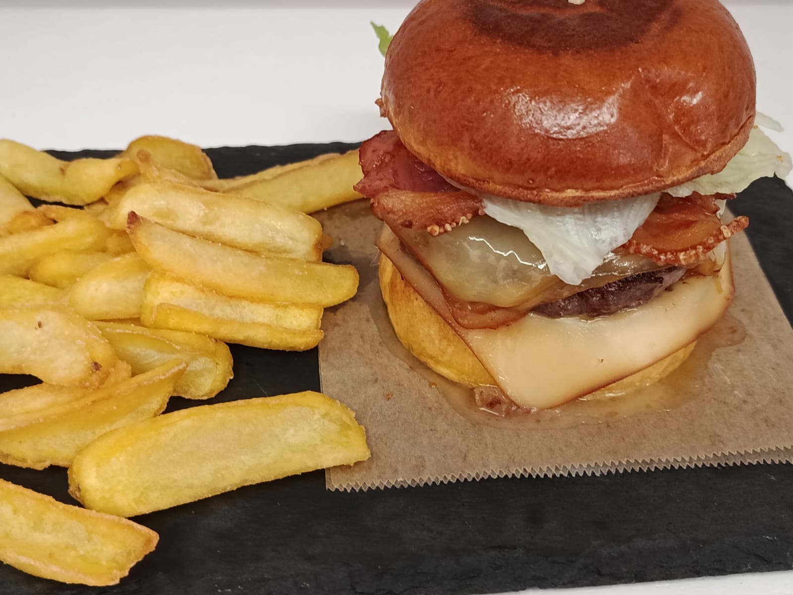 Arranca con pan High Queen’s, suave y doradito, abrazando un medallón brutal de vaca asturiana con el toque 🔥 de los jalapeños. Encima va queso ahumado derretido, cebolla pochada que endulza el combo y una panceta crujiente que suena a gloria.
