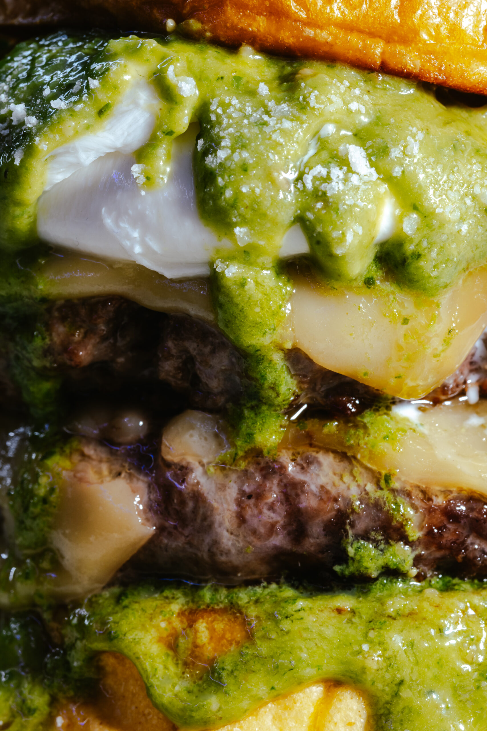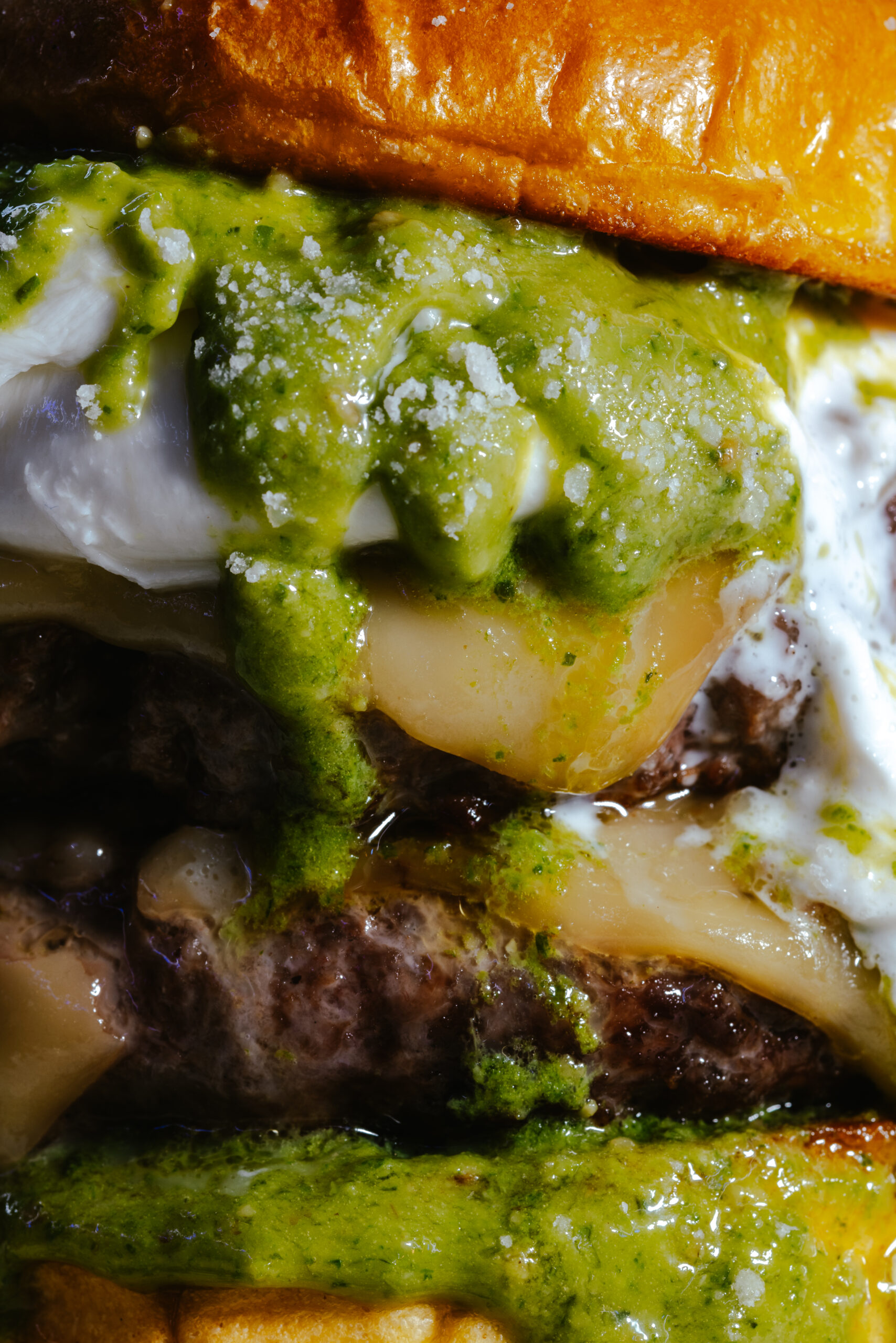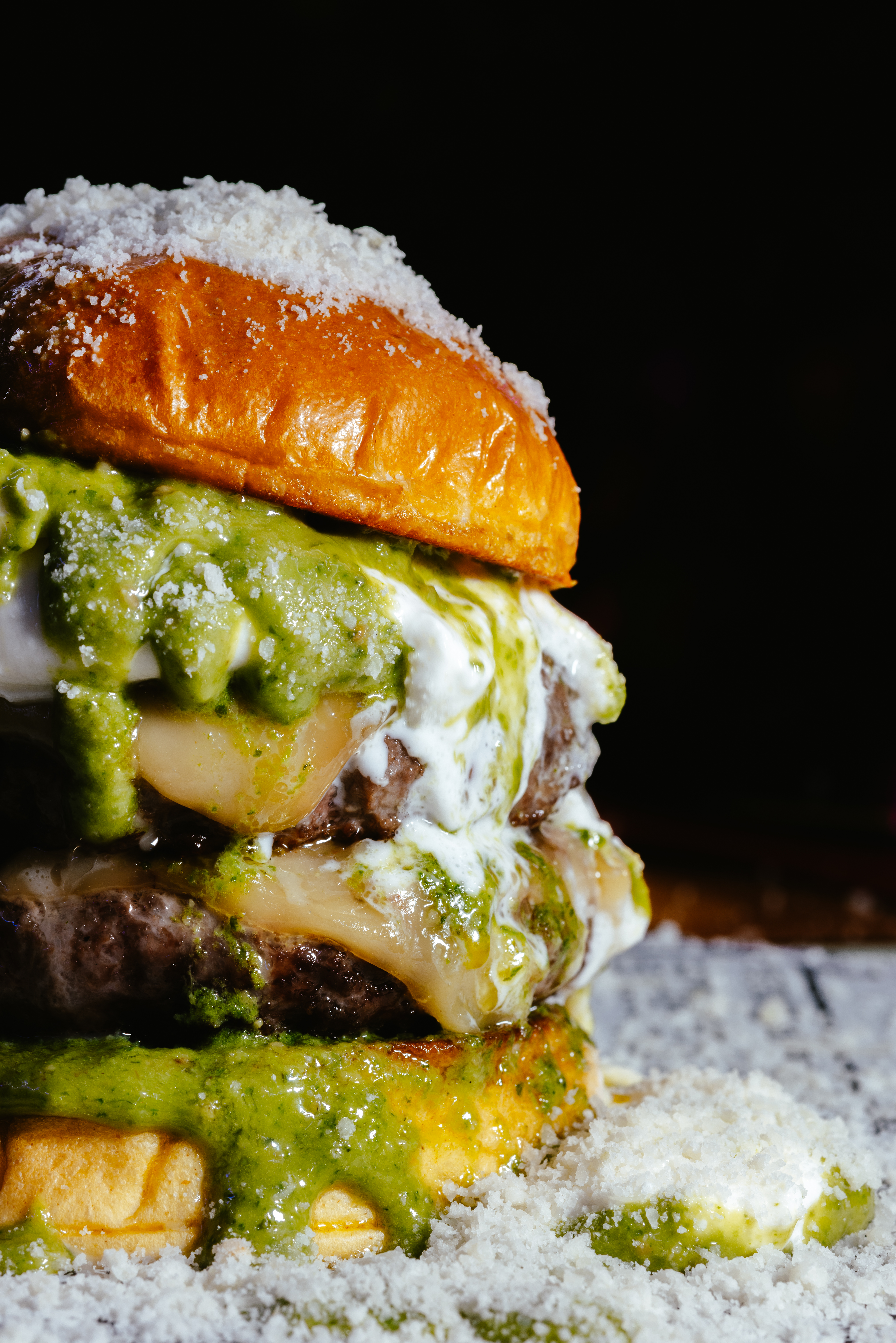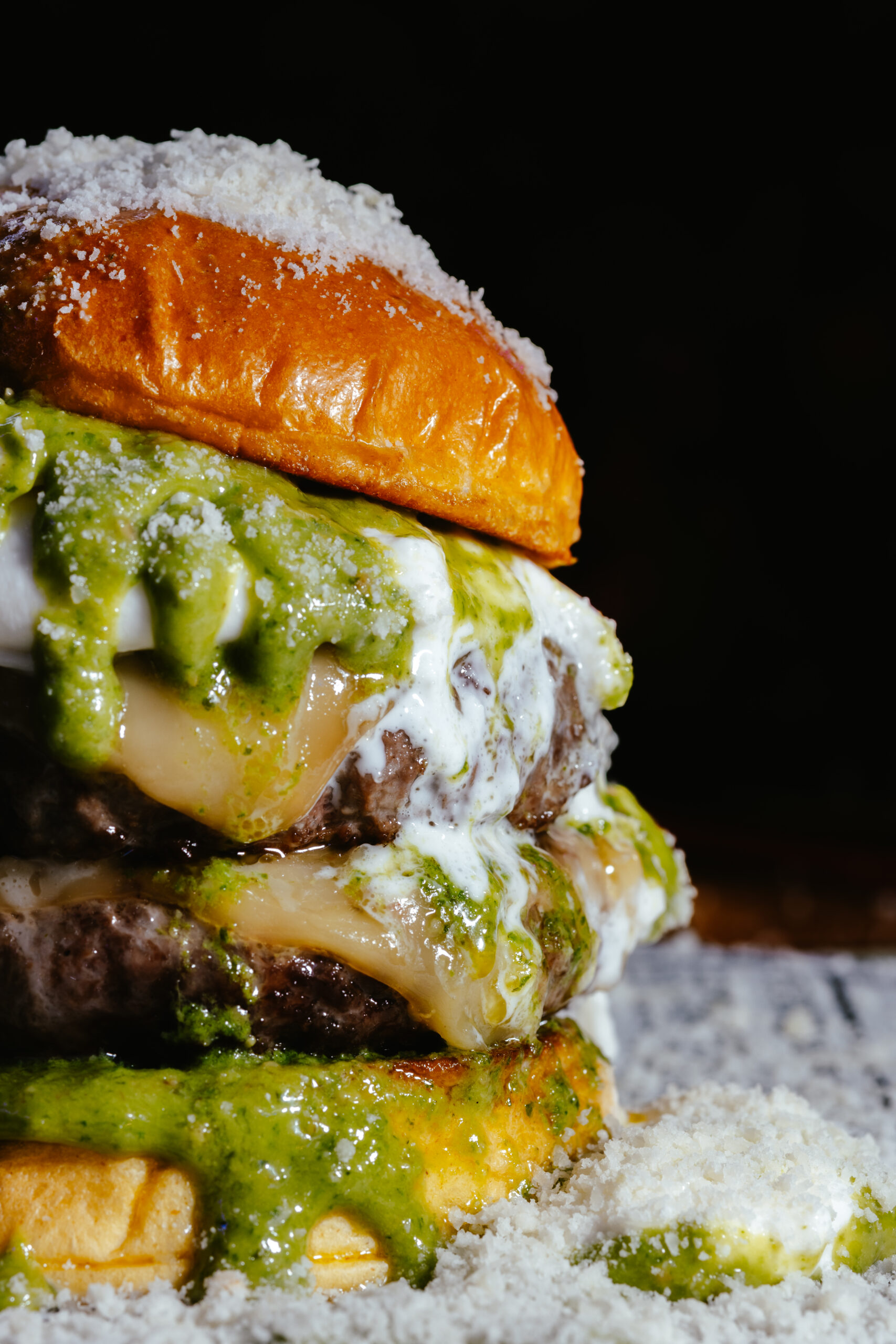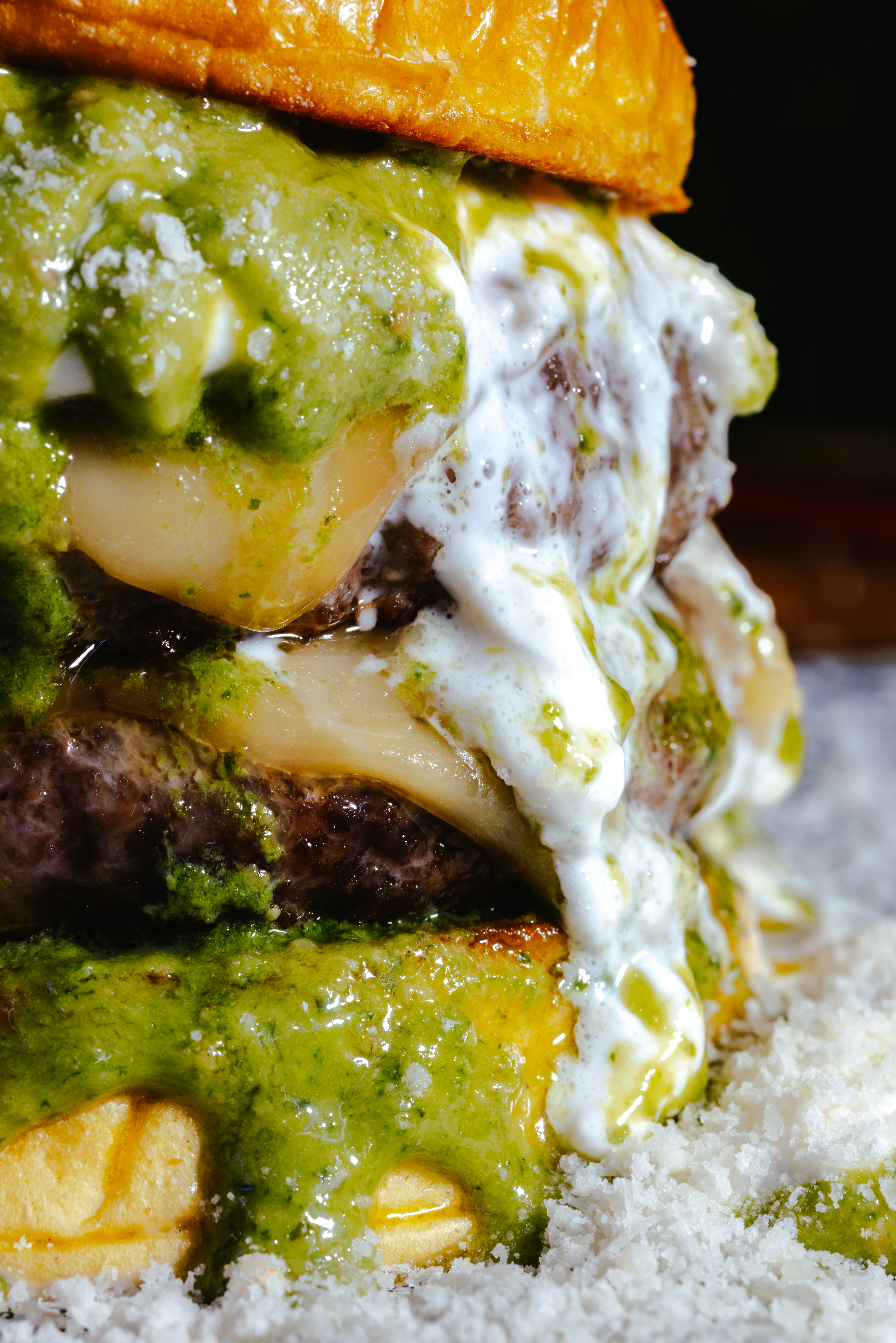 Pan artesano brioche con mantequilla ahumada y bautizado con tierra de parmesano Doble de Nuestra carne dry aged ( receta propia ) Queso provolone Pesto de albahaca ( receta traída de uno de mis viajes a Italia ) Queso burrata Salsa essenza di formaggio