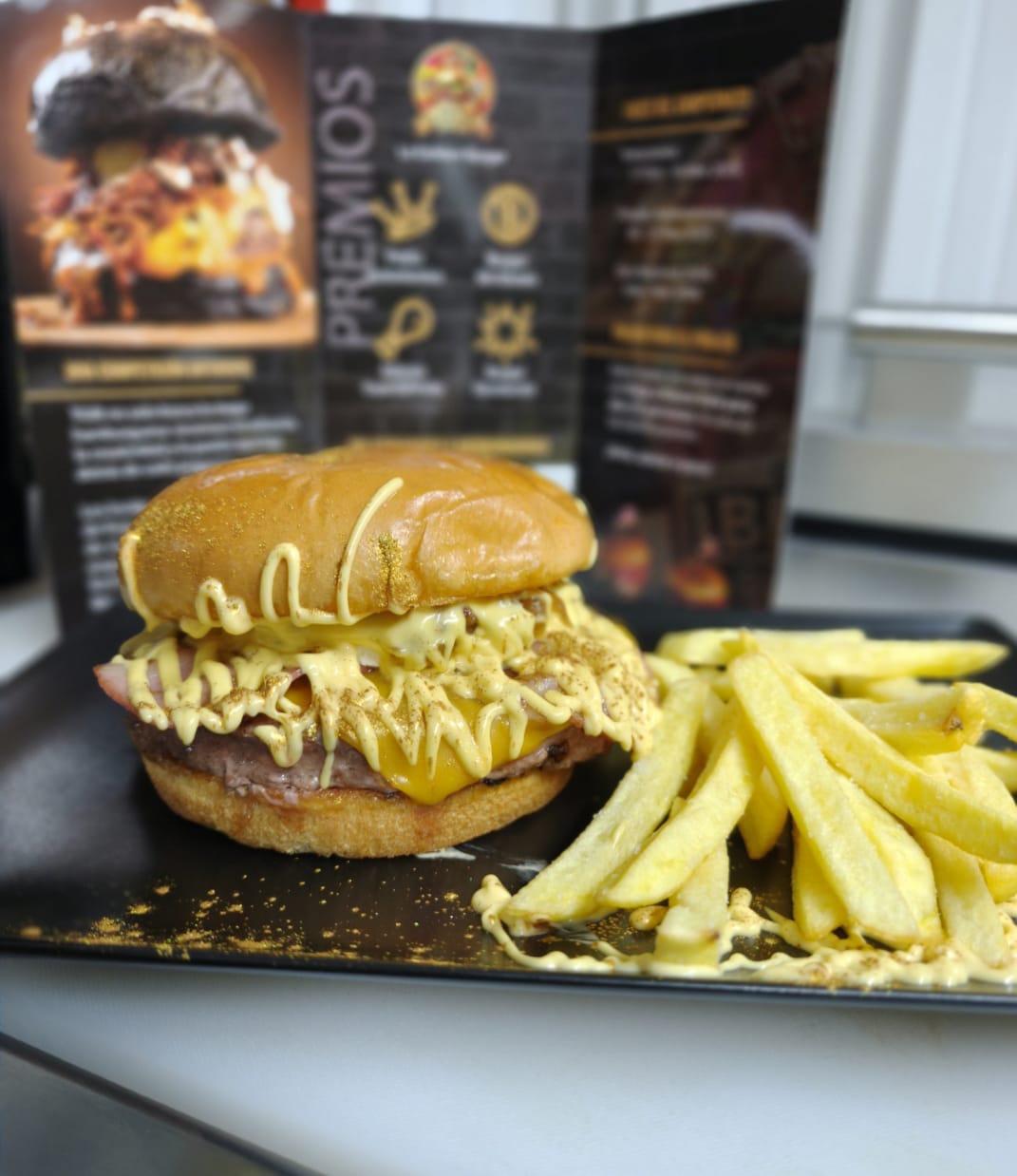 En su interior, una hamburguesa Angus de 200 g, jugosa y cocinada al punto perfecto, se funde con la intensidad del queso cheddar y la suavidad del queso de cabra. El bacon aporta un contrapunto ahumado y salino que realza cada matiz, mientras la cebolla caramelizada y la salsa de miel y mostaza equilibran el conjunto con dulzura y armonía.