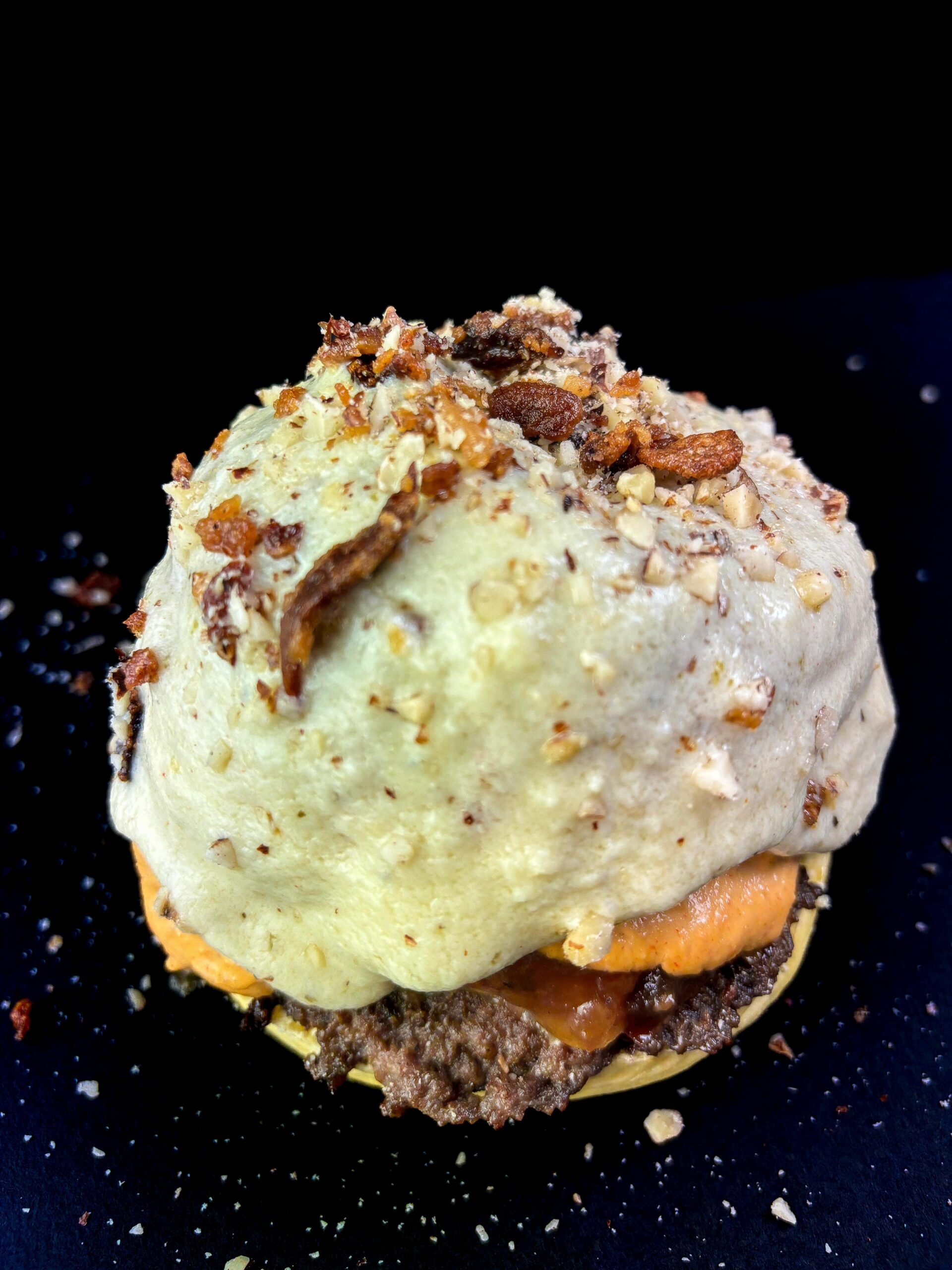 crumble de panceta y polvu de ablanes.