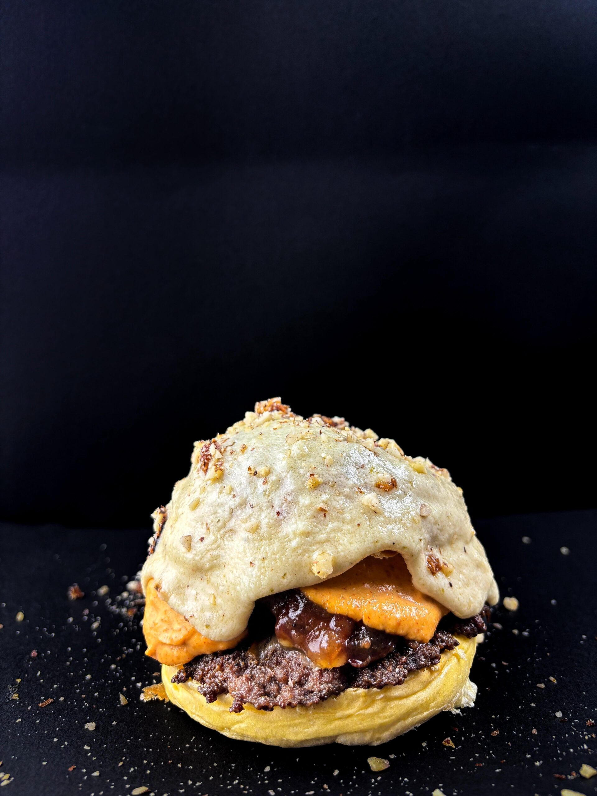 2 carnes de 90g de vaca, pan brioche, quesu afumiaú, mermelada de