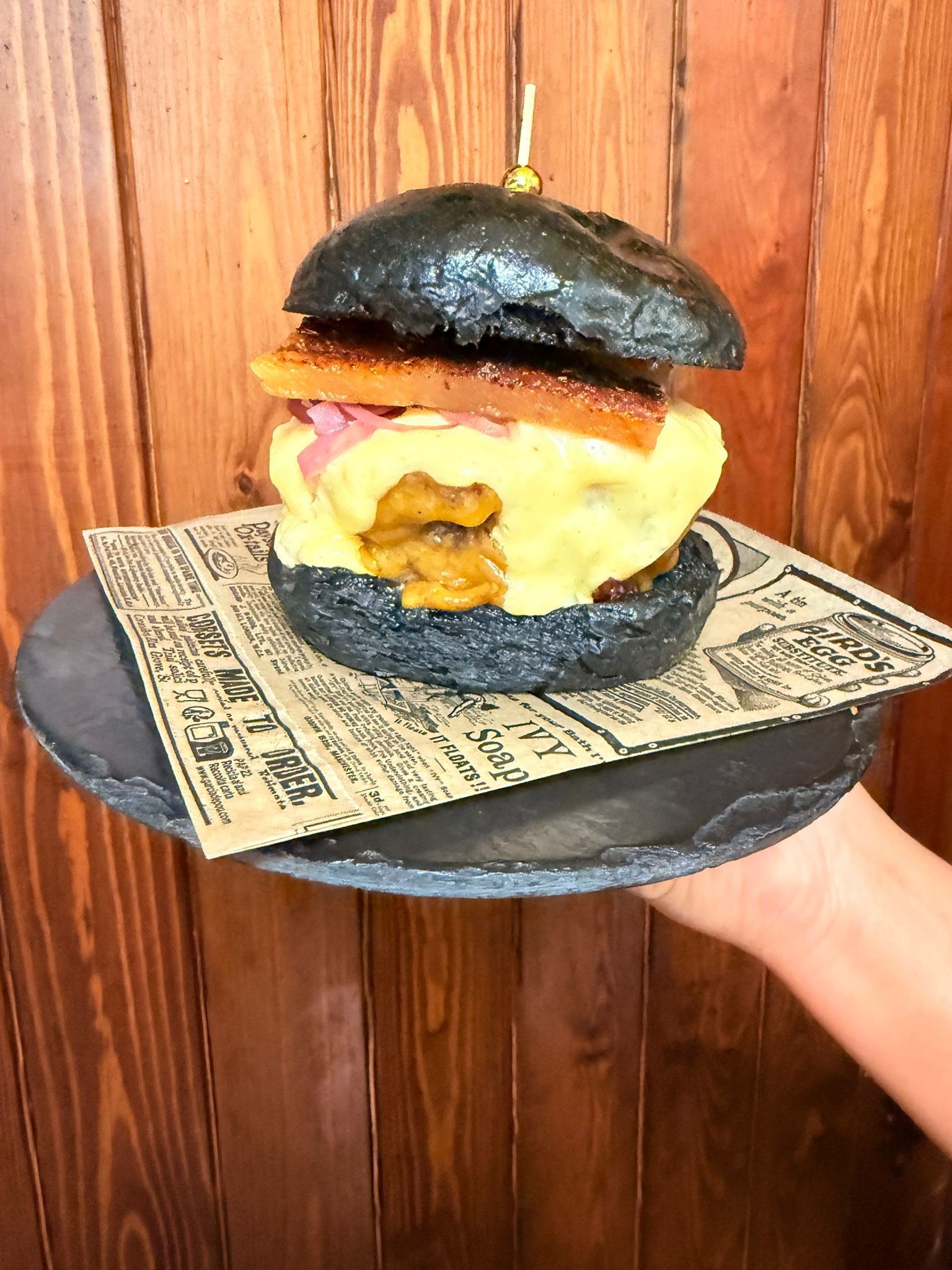 Doble carne de vaca vieja del Pais Vasco, queso cheddar, cebolla encurtida, mermelada de peperoni y salsa cheetos en pan brioche