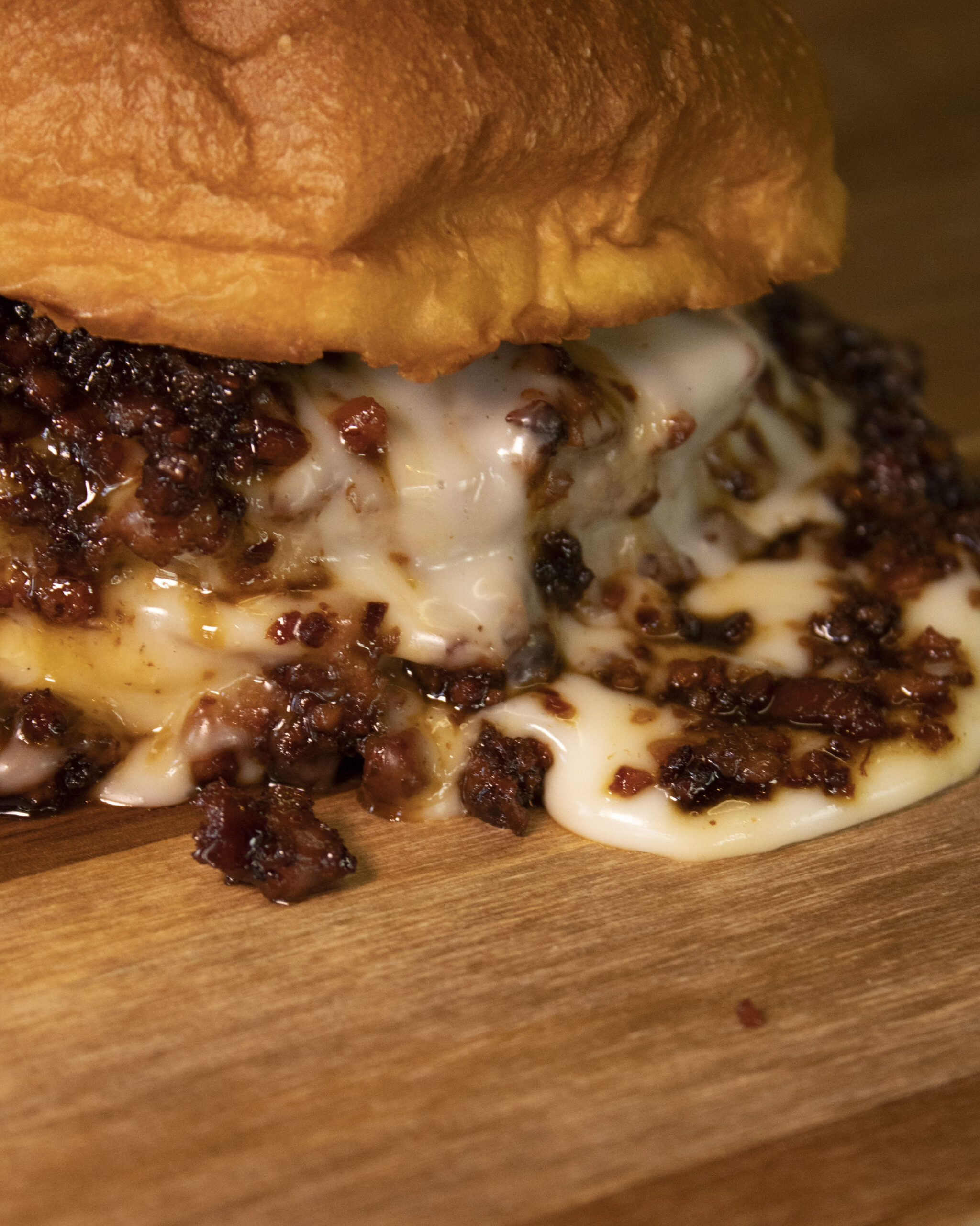 Pão de leite brioche, 160g black angus burger, queijo de cabra da serra da estrela, bacon caramelizado no melaço de cana.