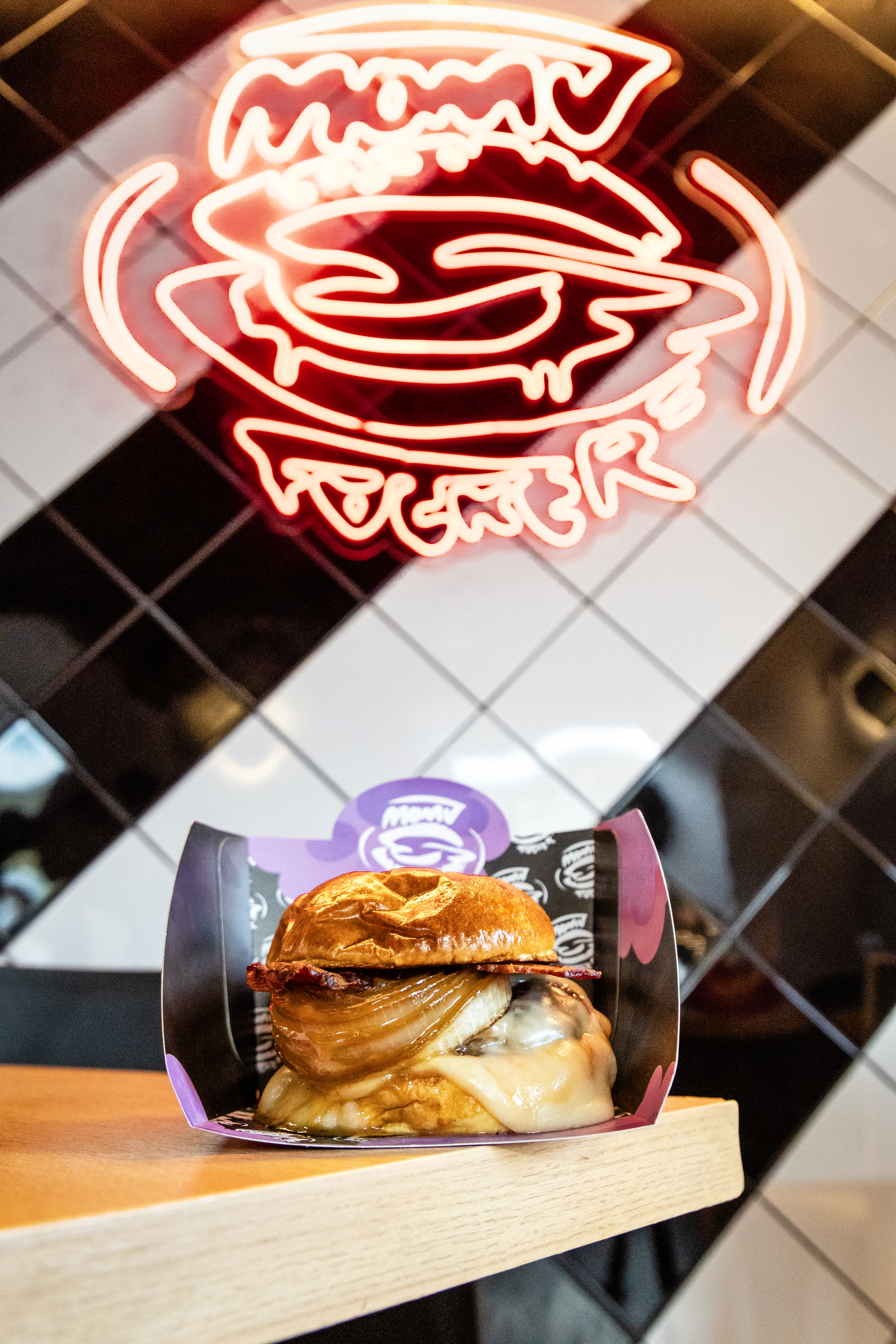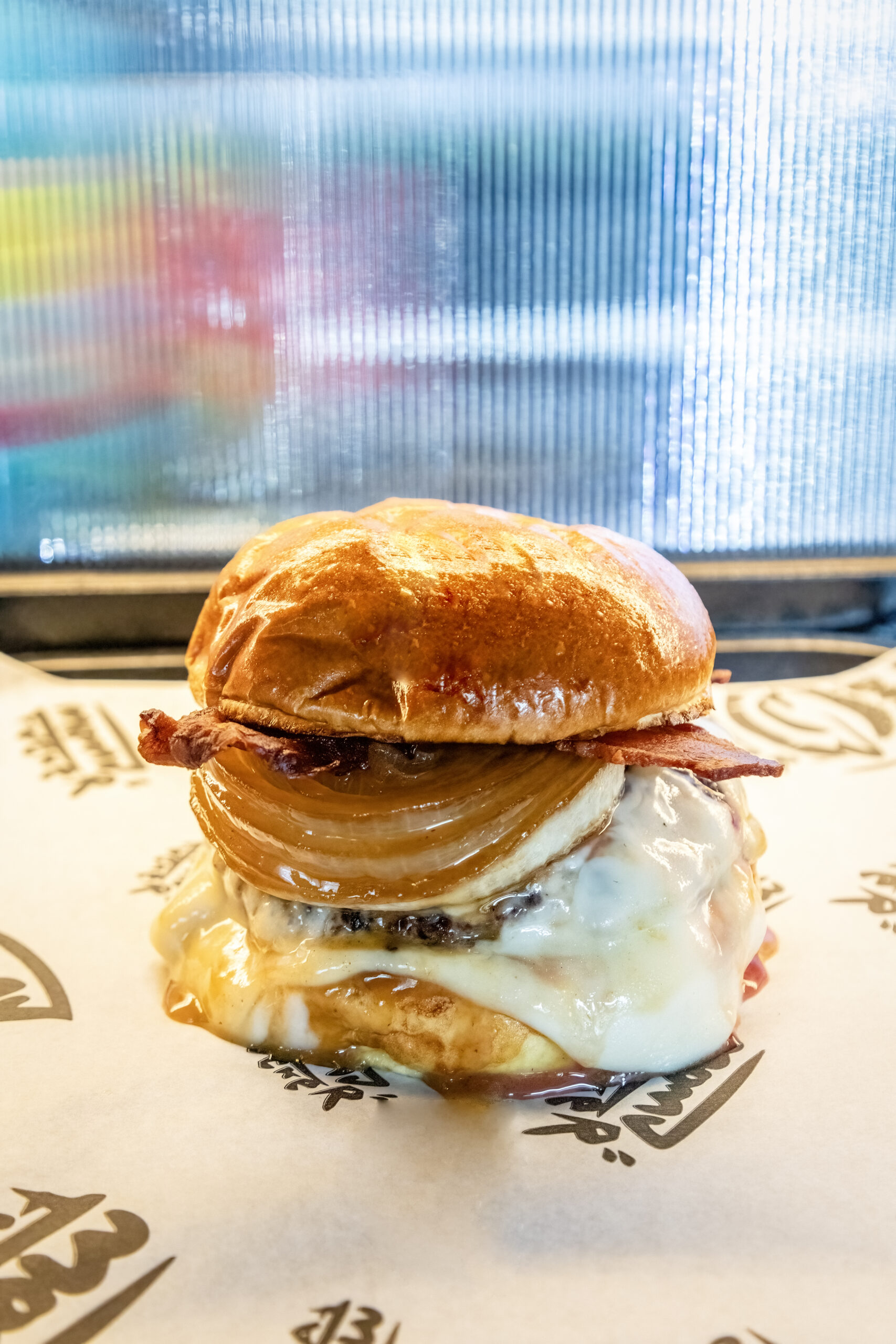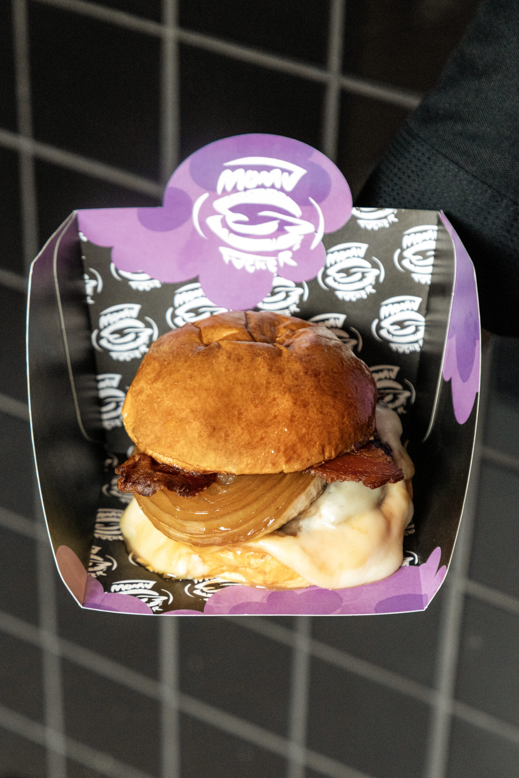Jugosa carne de vaca madurada 30dias con Veloute de pollo cubierta de tetilla coronada con una cebolla caramelizada todo esto entre 2 rebanadas de pan brioche de patata y bacon crujiente