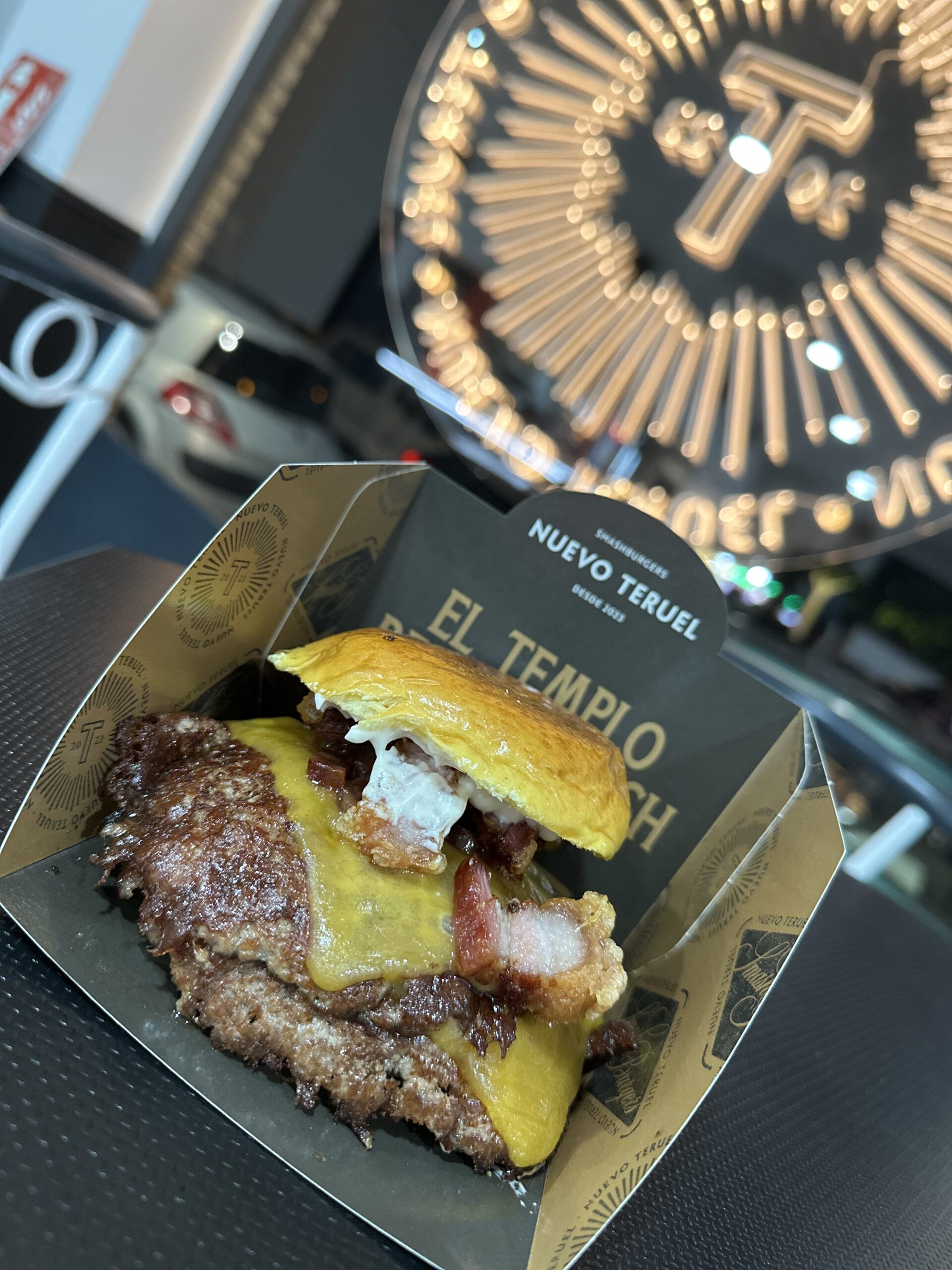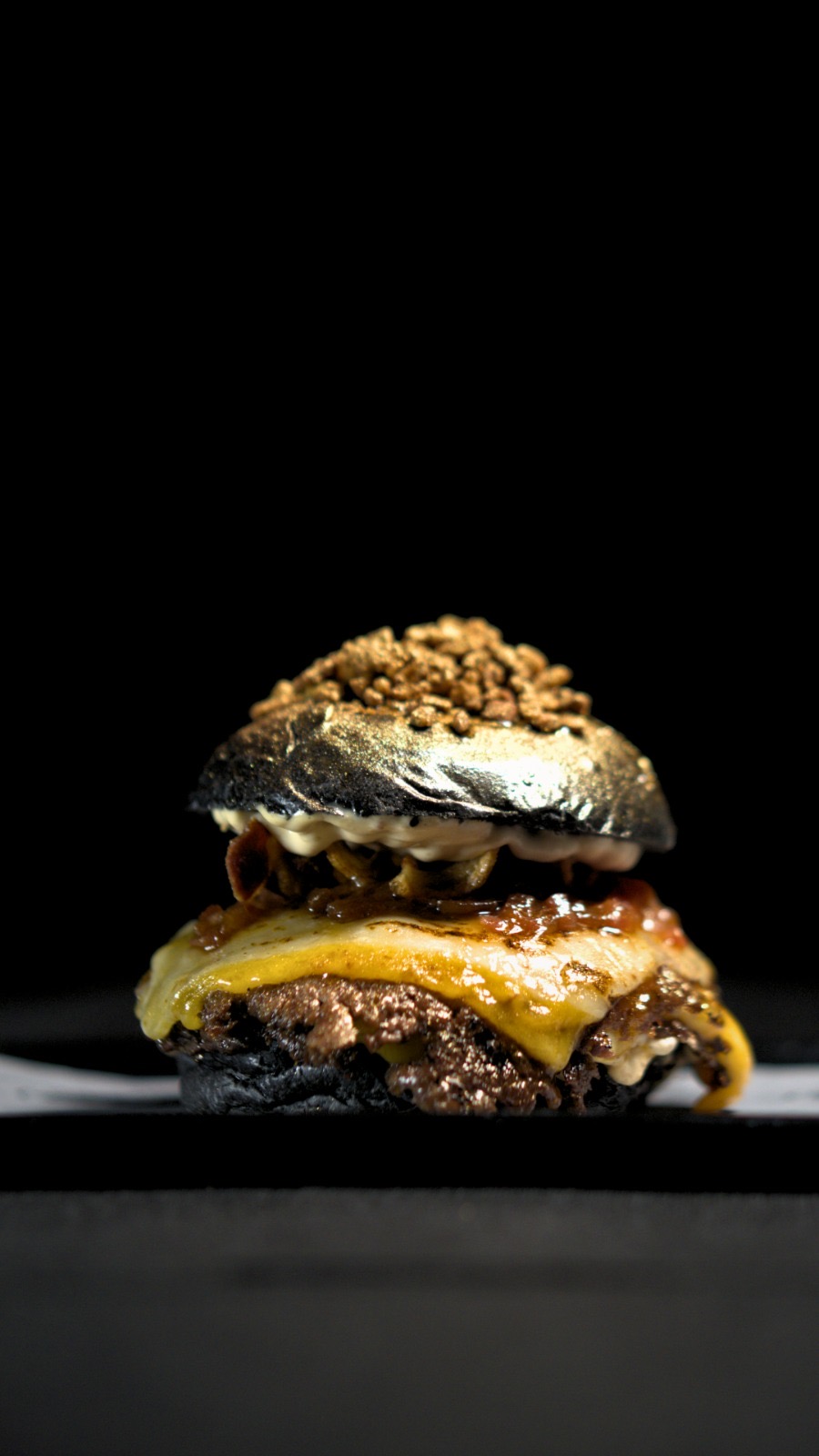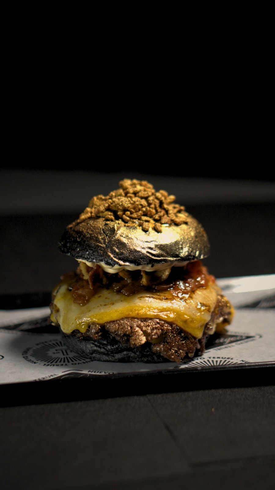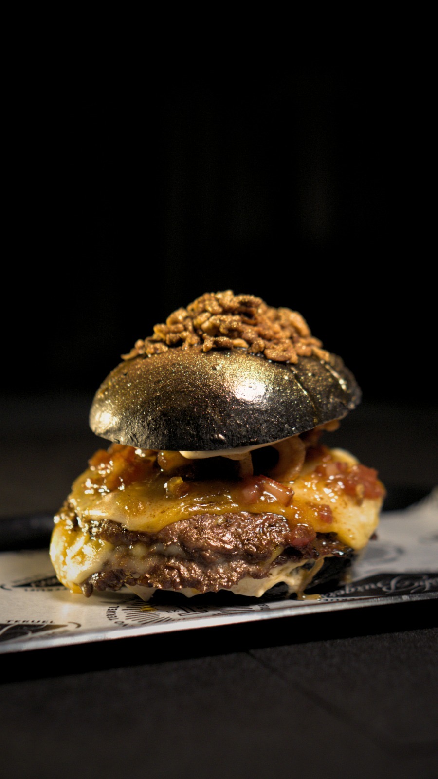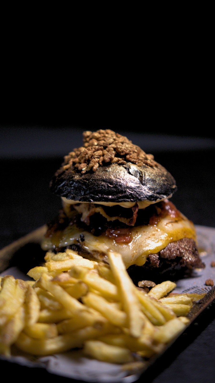 Pan brioche negro, doble smash de ternera, queso cheddar y gouda, mayonesa de chipotle ahumado, nuestra nueva mermelada de bacon, cebolla y tomate, almita de torrezno. Coronados con bits de torrezno espolvoreados en color oro.