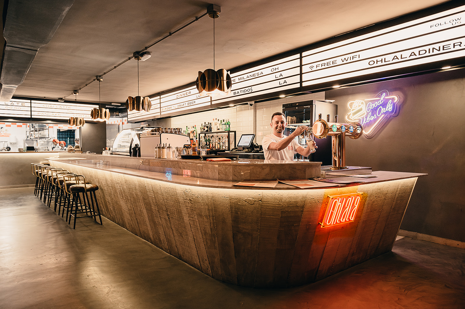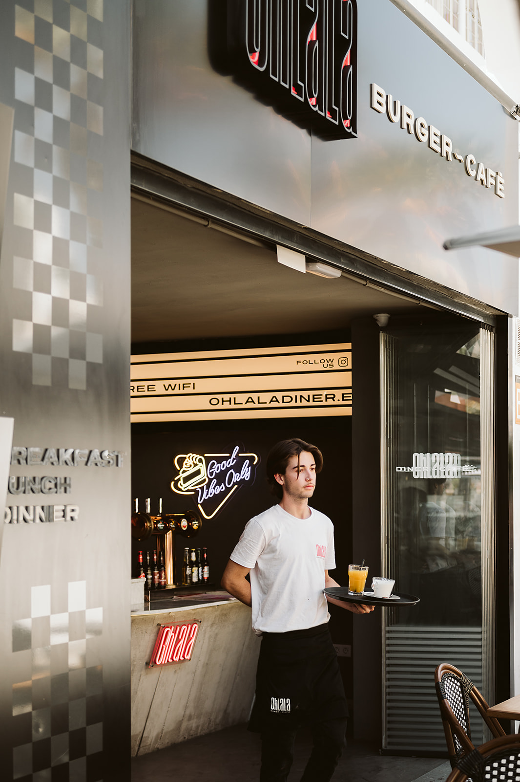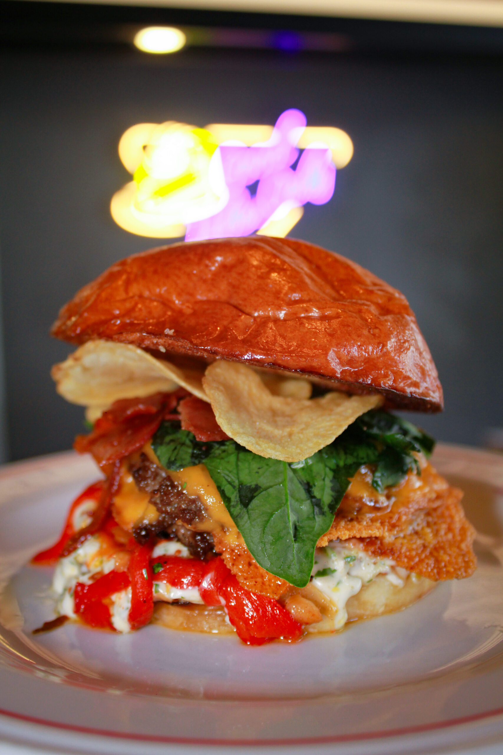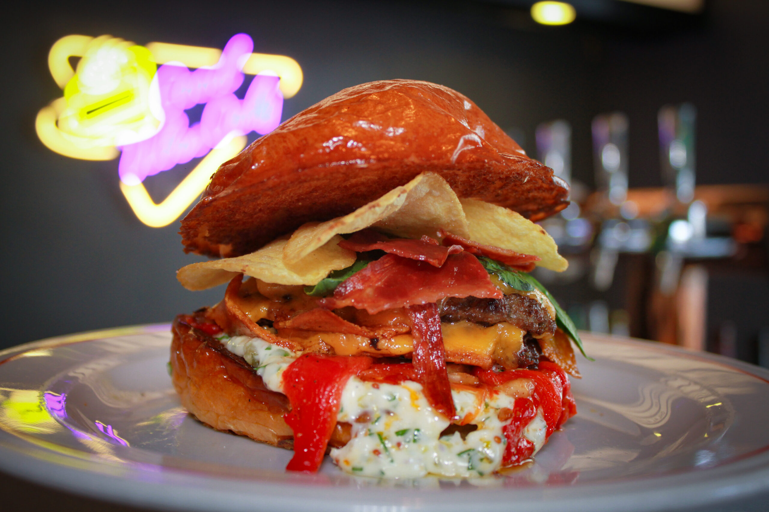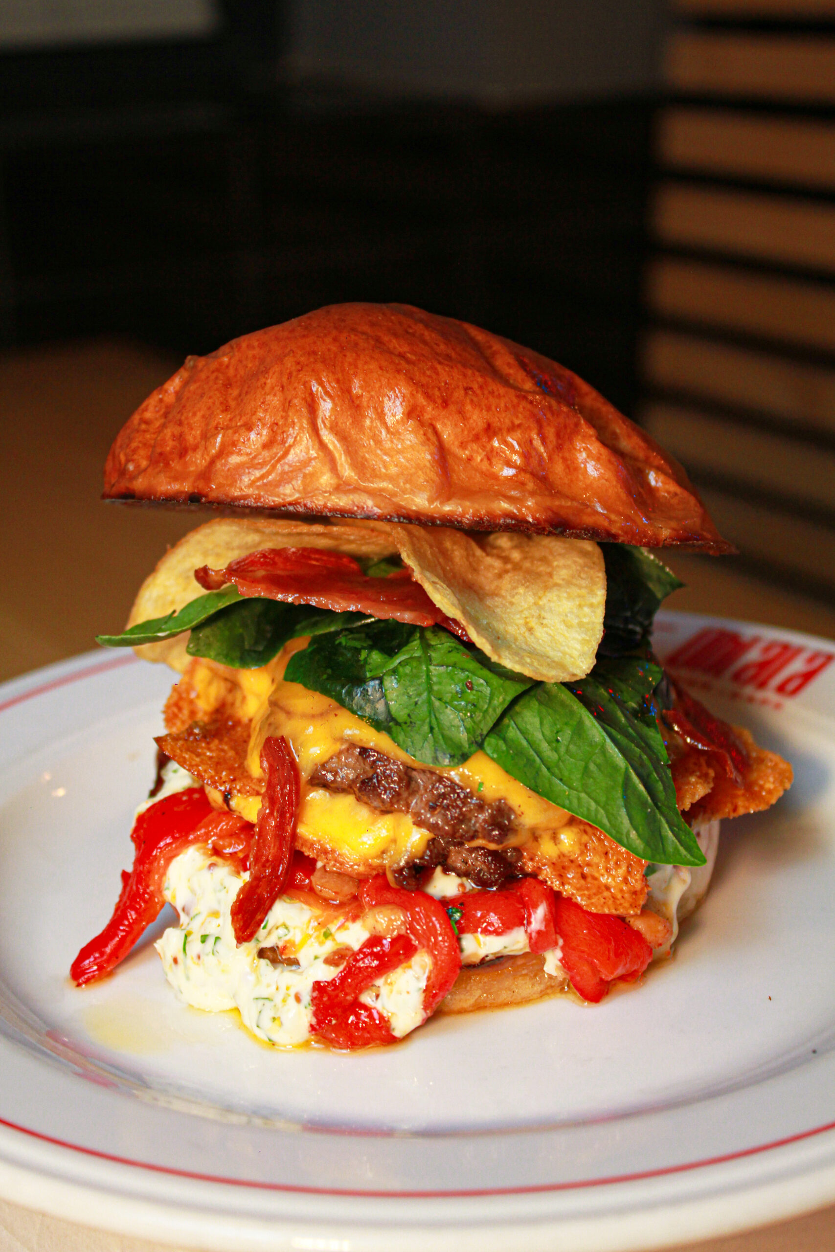 Pan brioche, salsa tártara, pimiento rojo asado con anacardos, dos hamburguesas smash de 75g con cebolla roja y comino, queso cheddar, espinacas con bacon crujiente y vinagreta de miel de palma, chips de patatas