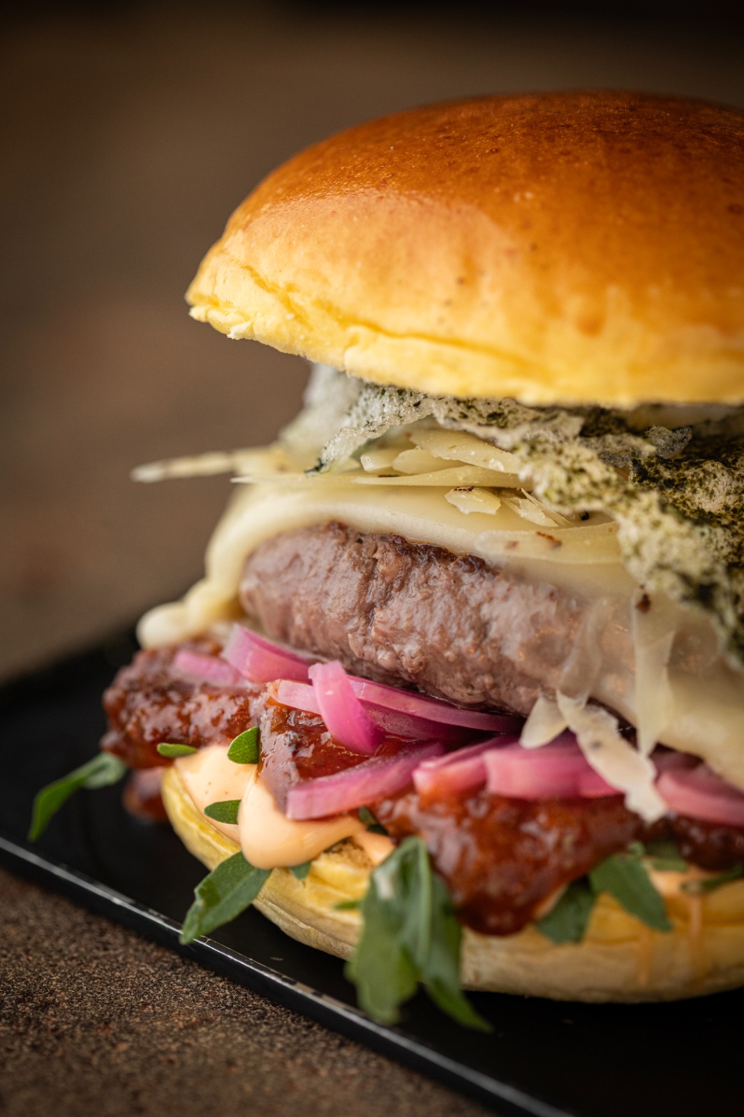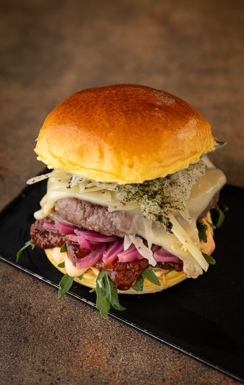 La identidad del territorio late en cada capa: cebolla encurtida al vino de Rueda, mermelada de cecina y tinto de Ribera, y la fuerza de los quesos de Valladolid —Viejo Tostado mezcla y Gouda— que aportan carácter y cremosidad. La frescura de la rúcula y la sorpresa crujiente de los chips de arroz con nori y limón completan una experiencia sensorial sofisticada, equilibrada y absolutamente inolvidable.