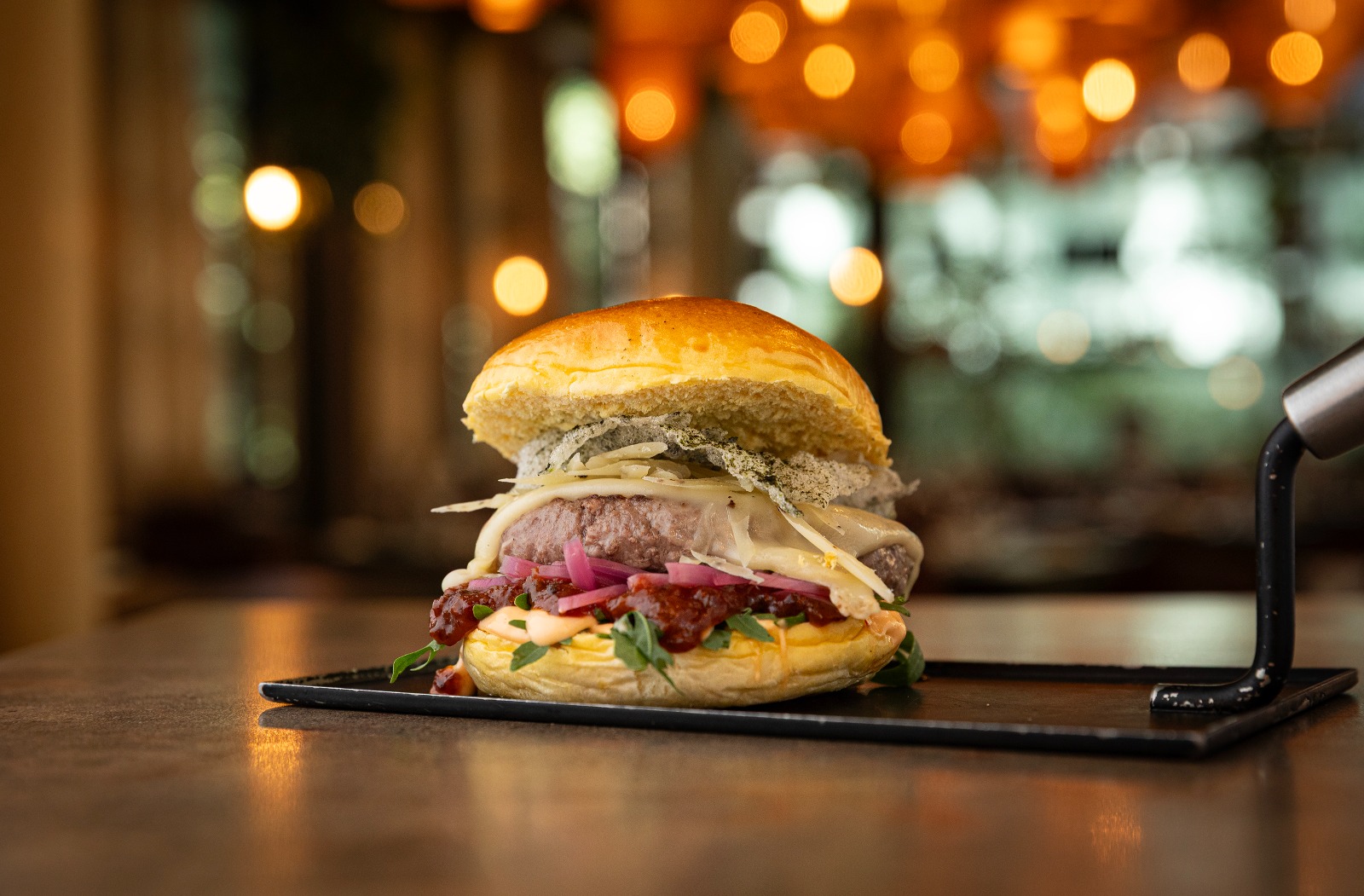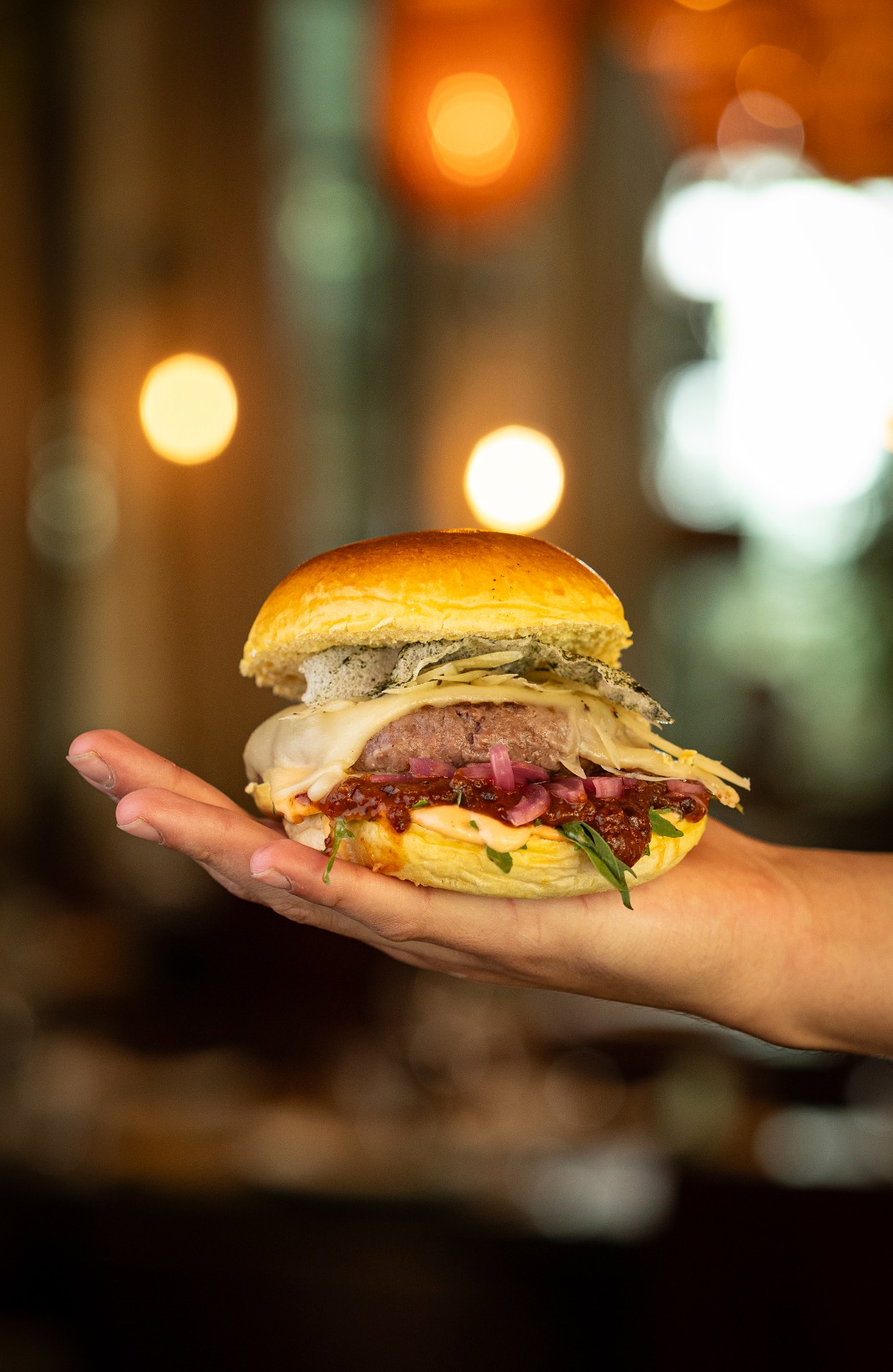 Sobre un esponjoso pan roll de patata, se eleva una carne única que fusiona ternera madurada y ssecreto ibérico, glaseada con bourbon y miel para lograr un contraste irresistible entre intensidad y dulzor.