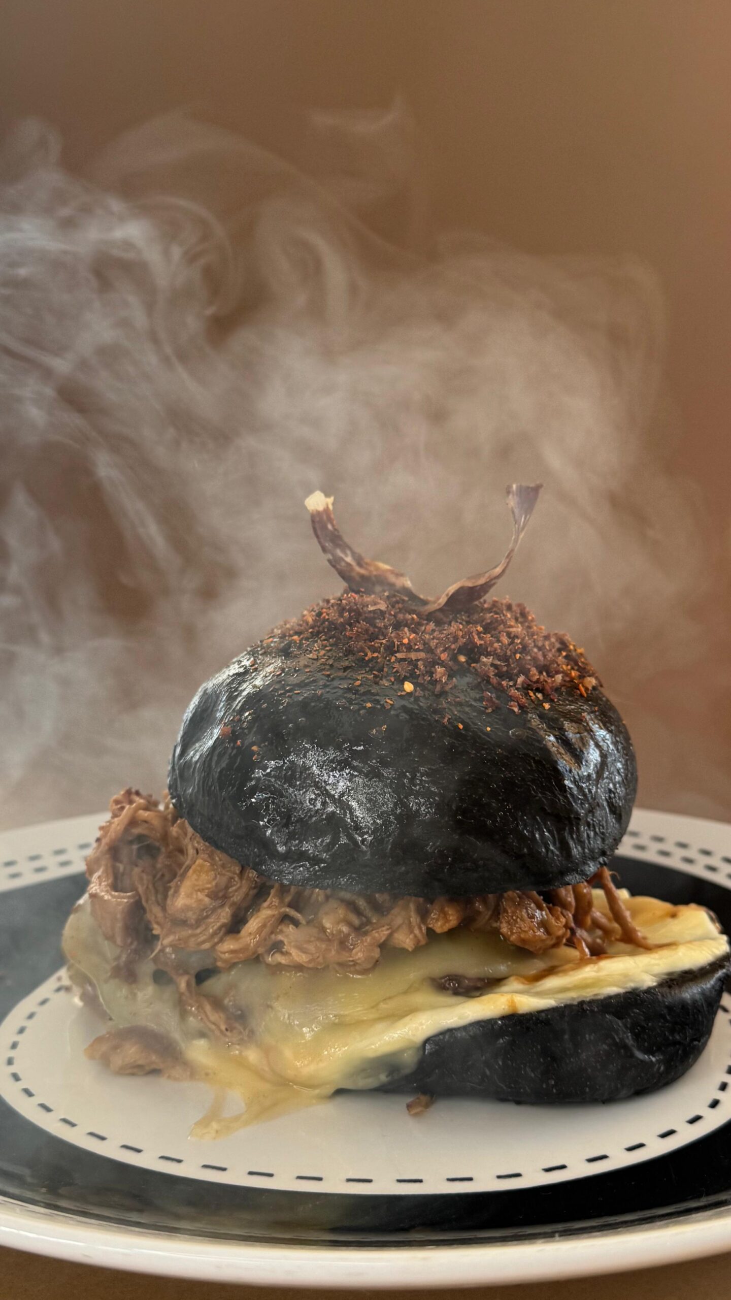 Brioche negro. 2 Smash burger. Queso ahumado Monterrey. Ternera pulled en salsa barbacoa. Mayonesa de tuétano ahumada. Tomate huevo de toro asado a la parrilla. Cecina de león.