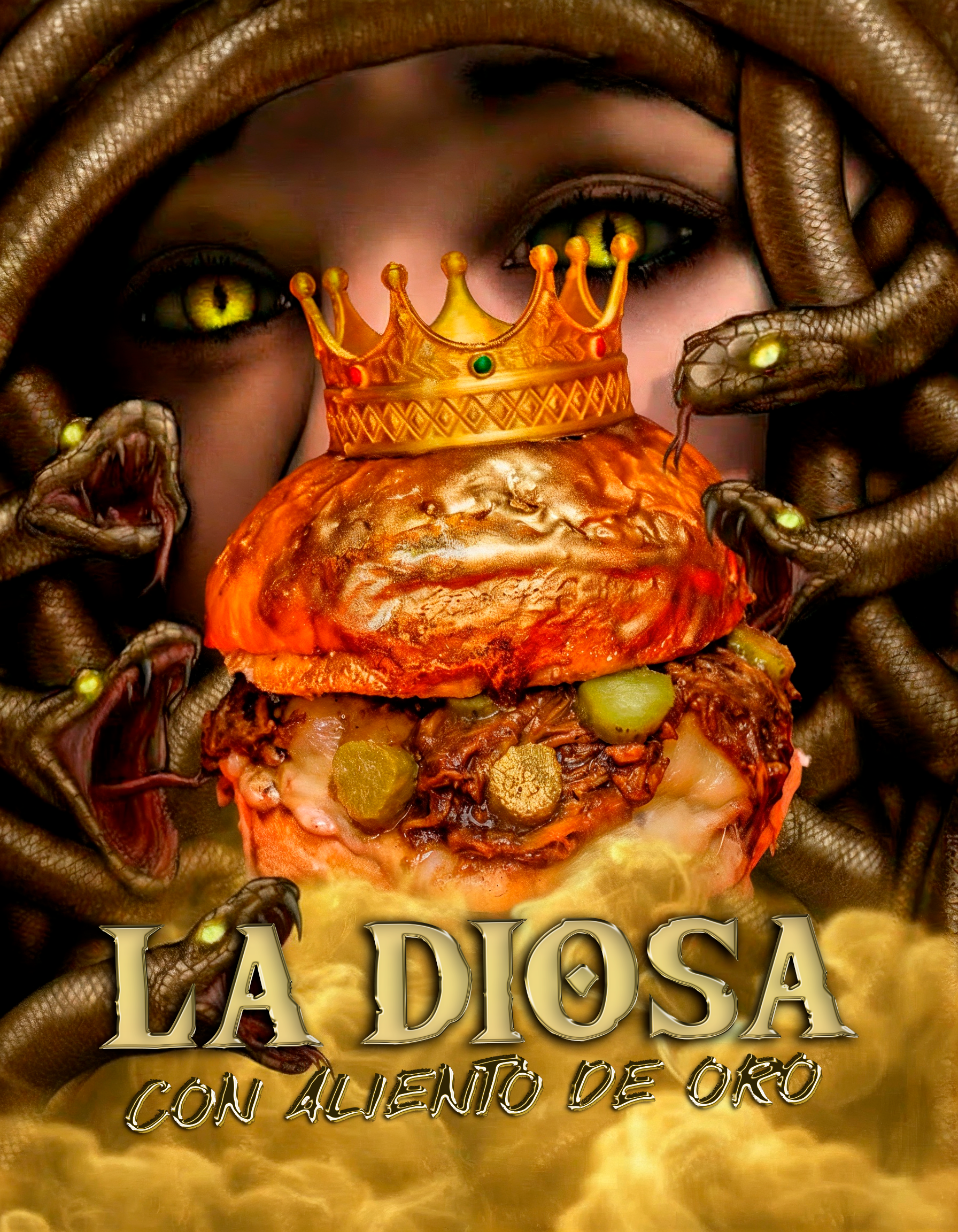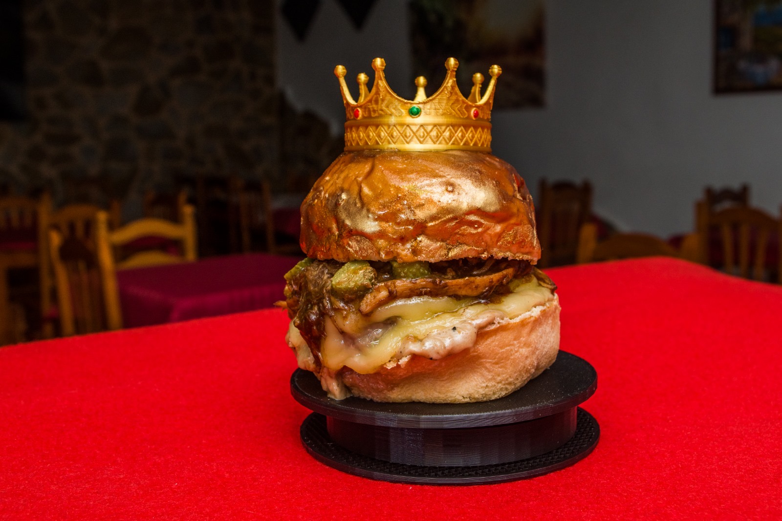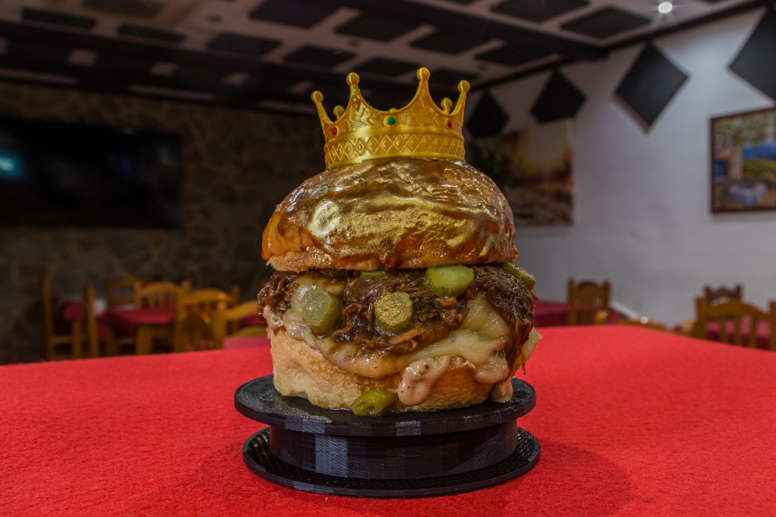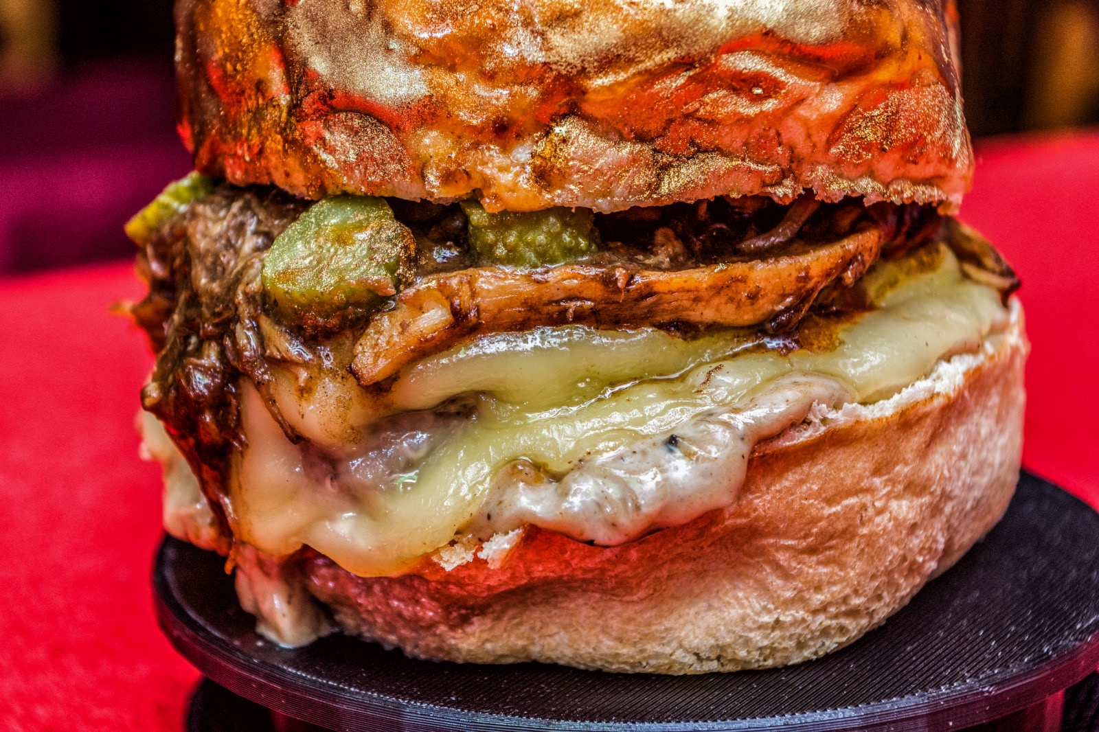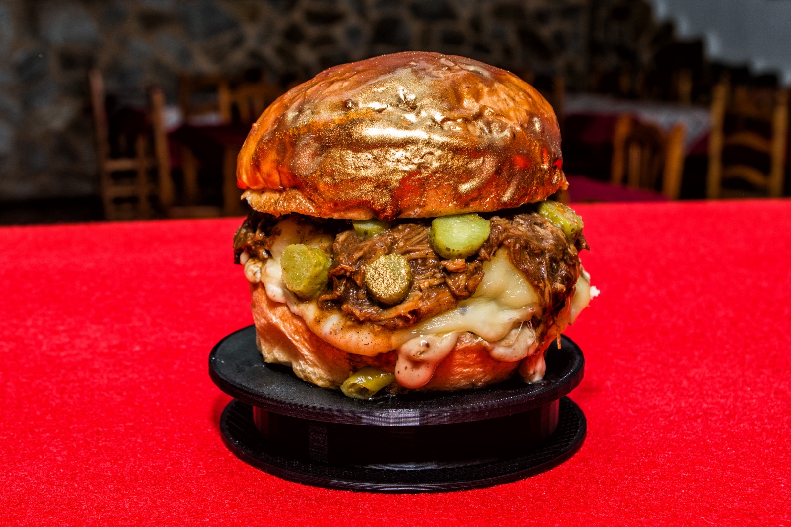 Pan de patata Queso gouda Carne desmechada pulled pork Pepinillos Carne de vaca madurada gallega (premiada en España a la mejor carne 2023) Salsa de ajo negro (la llamamos salsa secreta de la casa) Salsa coreana umami Polvo de oro comestible