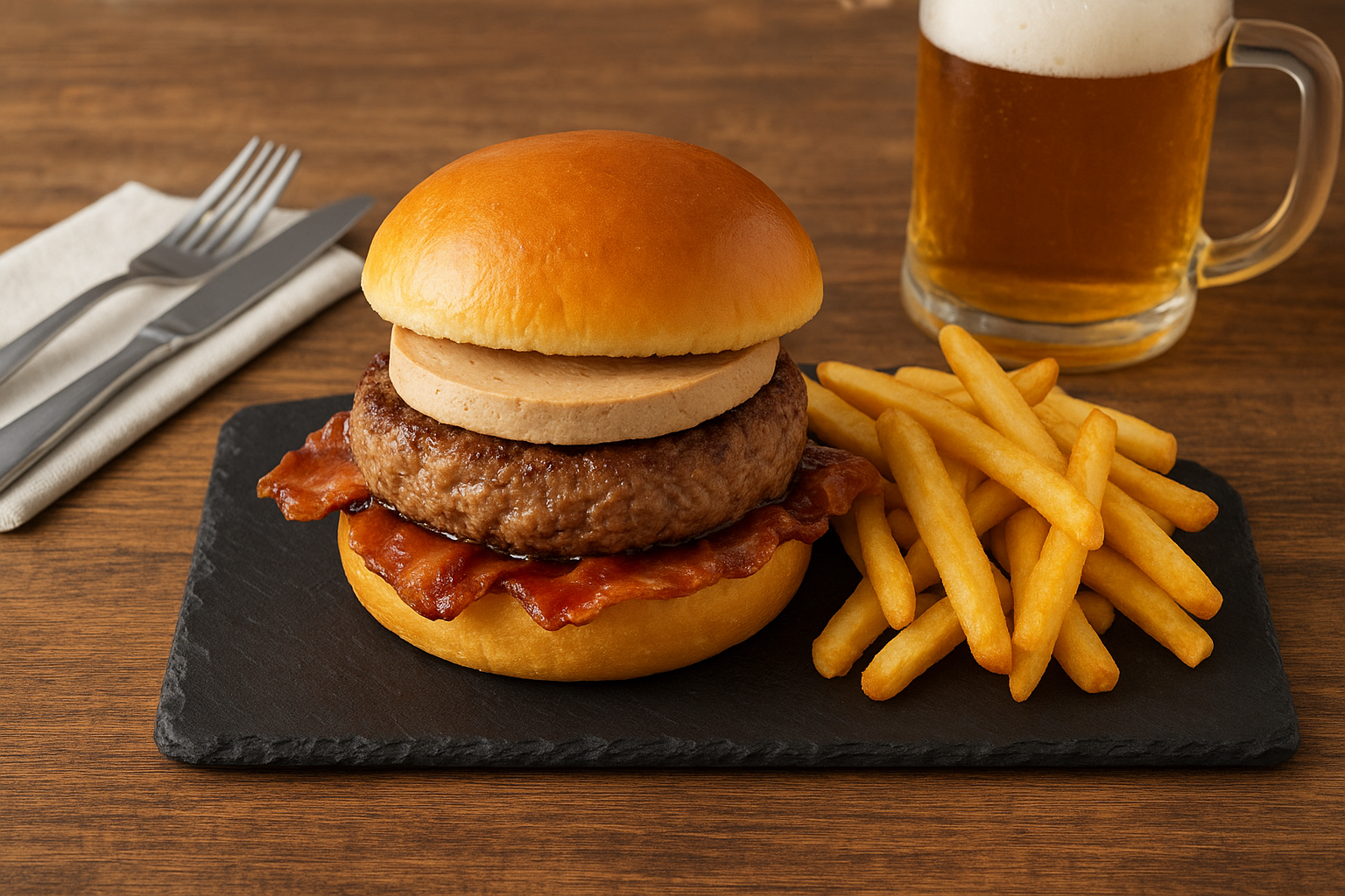 Panceta ibérica curada crunch, paté de foie y salsa especial.