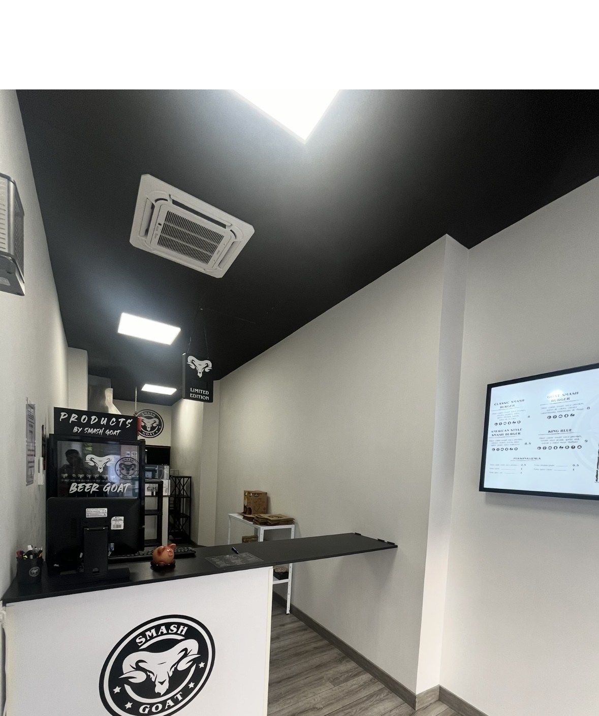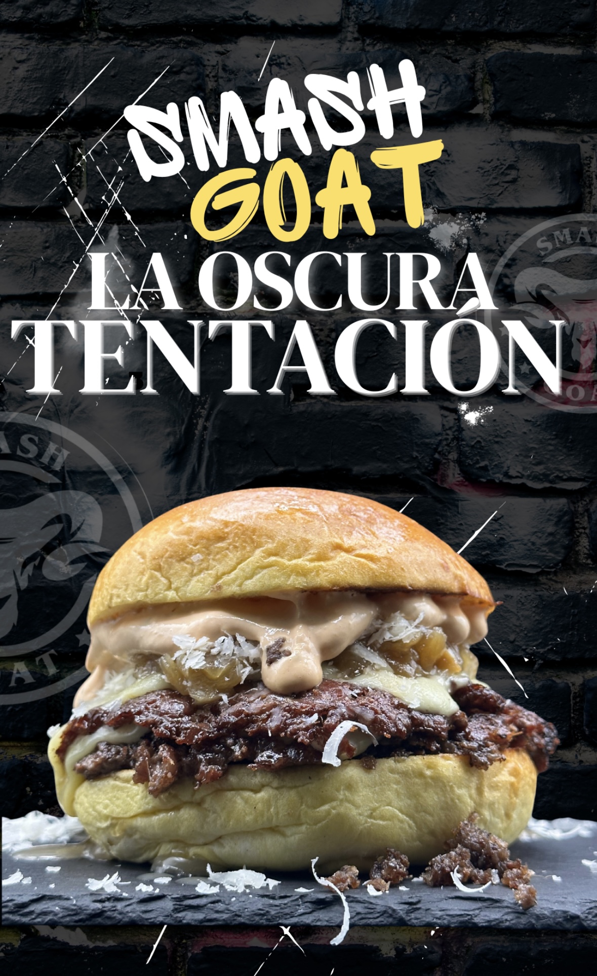 Pan brioche de patata, salsa Thousand Island, doble de carne de vaca smash premium, cebolla caramelizada, doble de queso gouda, base de morcilla picada y queso espolvoreado