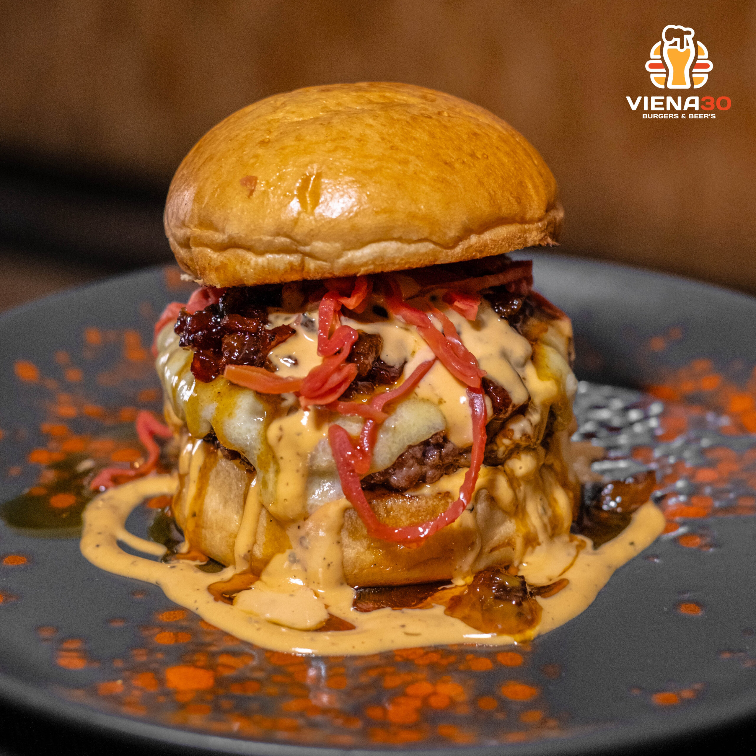 Su corazón, 180 g de nuestro Blend Premium, combina hasta cuatro cortes seleccionados, incluido chuletón madurado más de 60 días, para un sabor profundo y mantecoso. Se realza con una confitura de bacon y guanciale que aporta ese contraste dulce y salado perfecto, y una salsa de bacon que potencia su carácter ahumado.